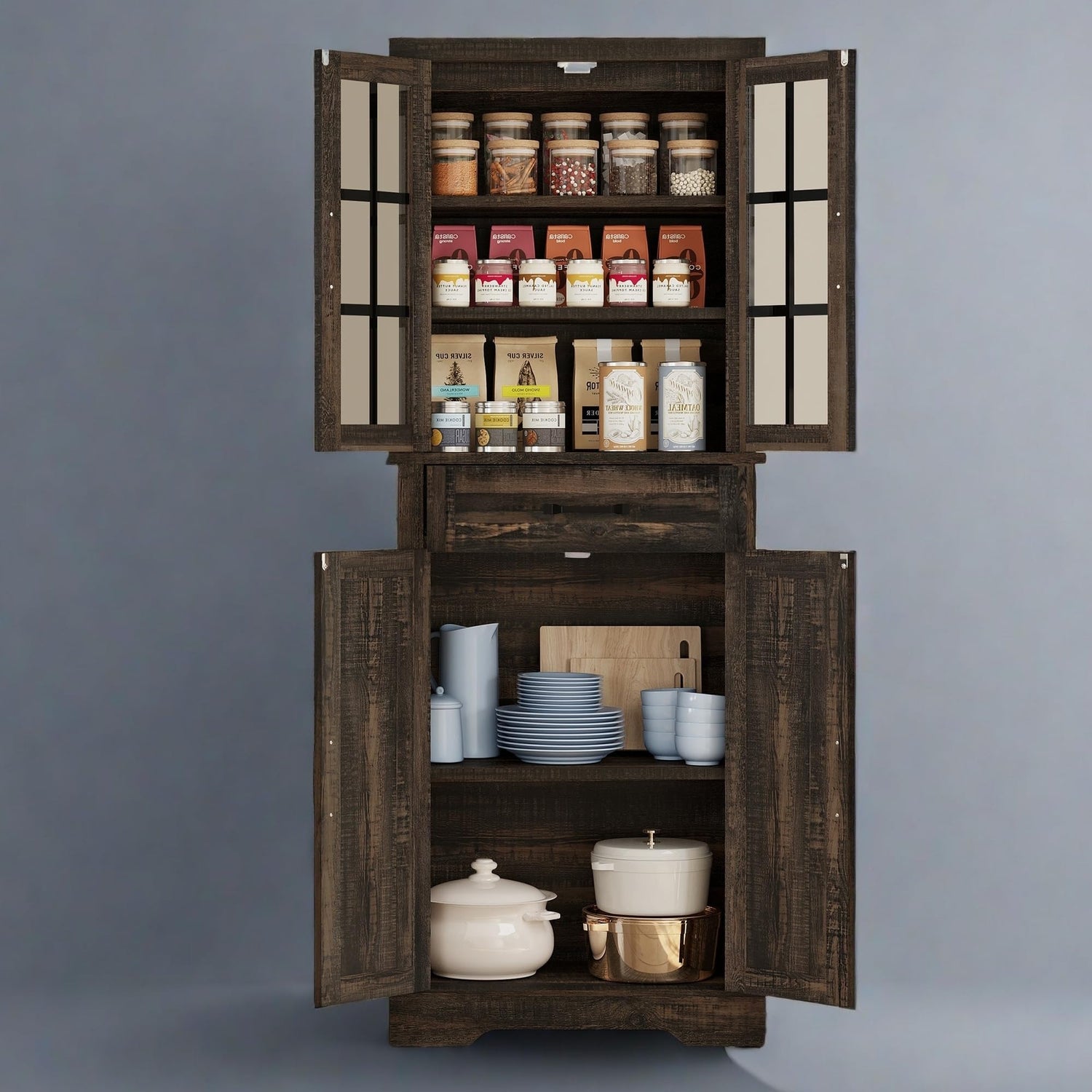 - Charming Rural Design: Elevate your kitchen with this crafted tall cabinet boasting an rustic dark brown finish. It blends seamlessly with any decor, offering both style and practical storage solutions, making it a standout piece in your home