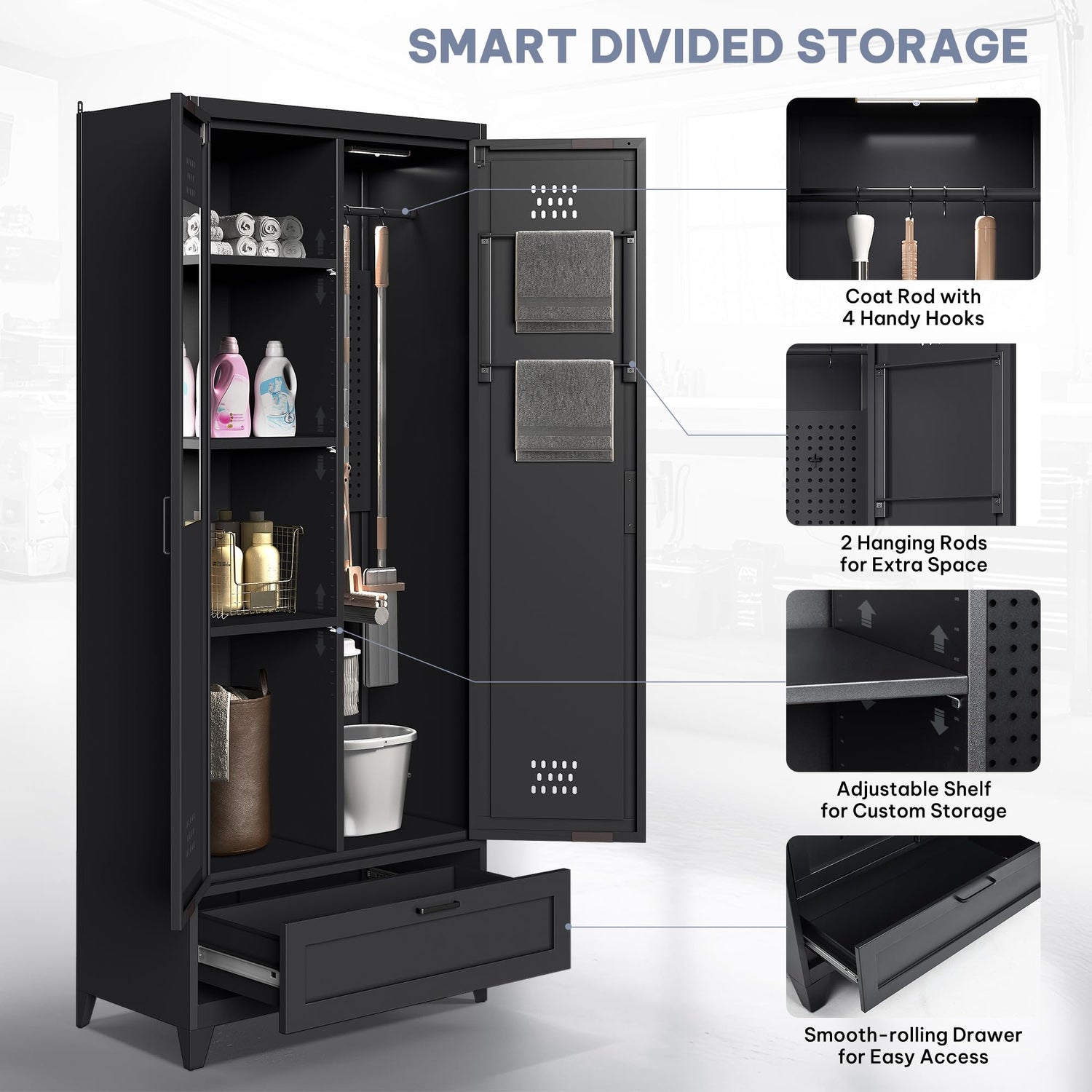 YITAHOME 71" Metal Garage Broom Cabinets with Adjustable Shelves, Vacuum Storage Cabinet with Doors and Drawer, Tool Storage Cabinet for Gym, Basement, Warehouse, Living Room, Black