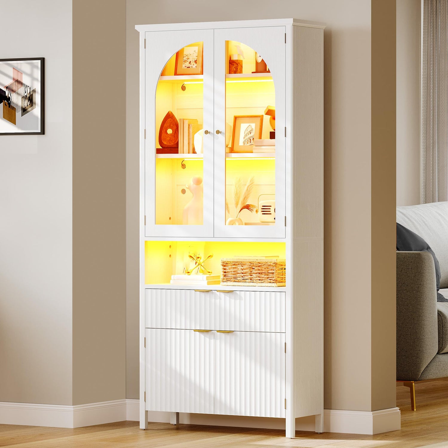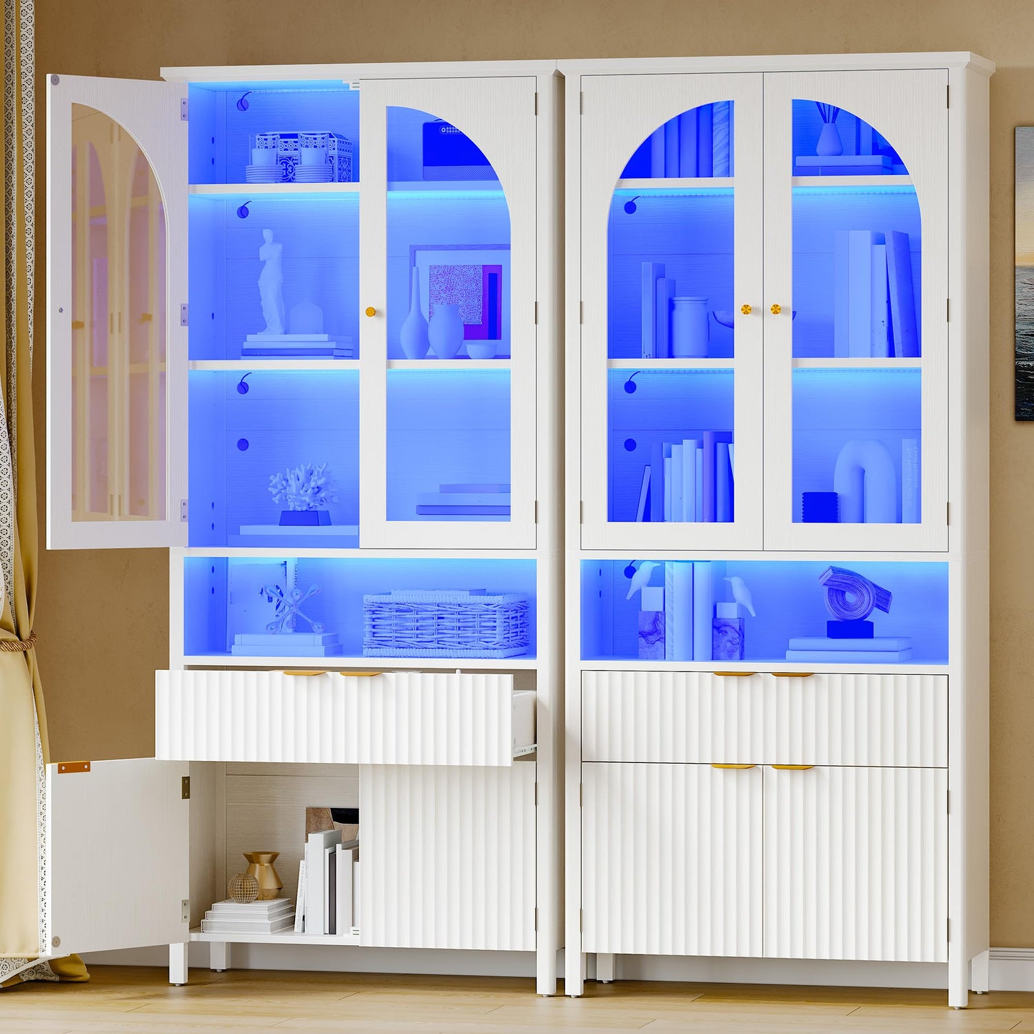 YITAHOME 72" Tall Fluted Bookshelf with LED Lights, White Bookcase with Drawers, Arched Glass Doors, 6-Tier Storage Cabinet Bookcase for Living Room, Office and Study
