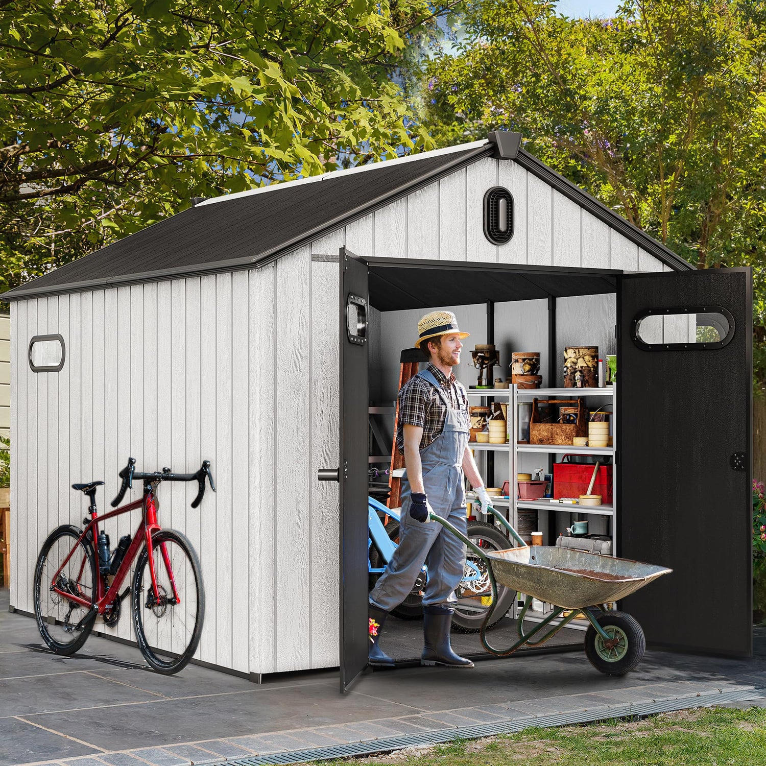 - Versatile Storage: Our 8'x10' bike storage shed boasts 544 cubic feet of capacity, providing secure and weatherproof shelter for garden tools, lawn equipment, bicycles, patio furnishings, and more; This multipurpose unit can even serve as a pet haven or plant greenhouse; Note: For convenient transportation, the product will be delivered in three packages that might arrive separately