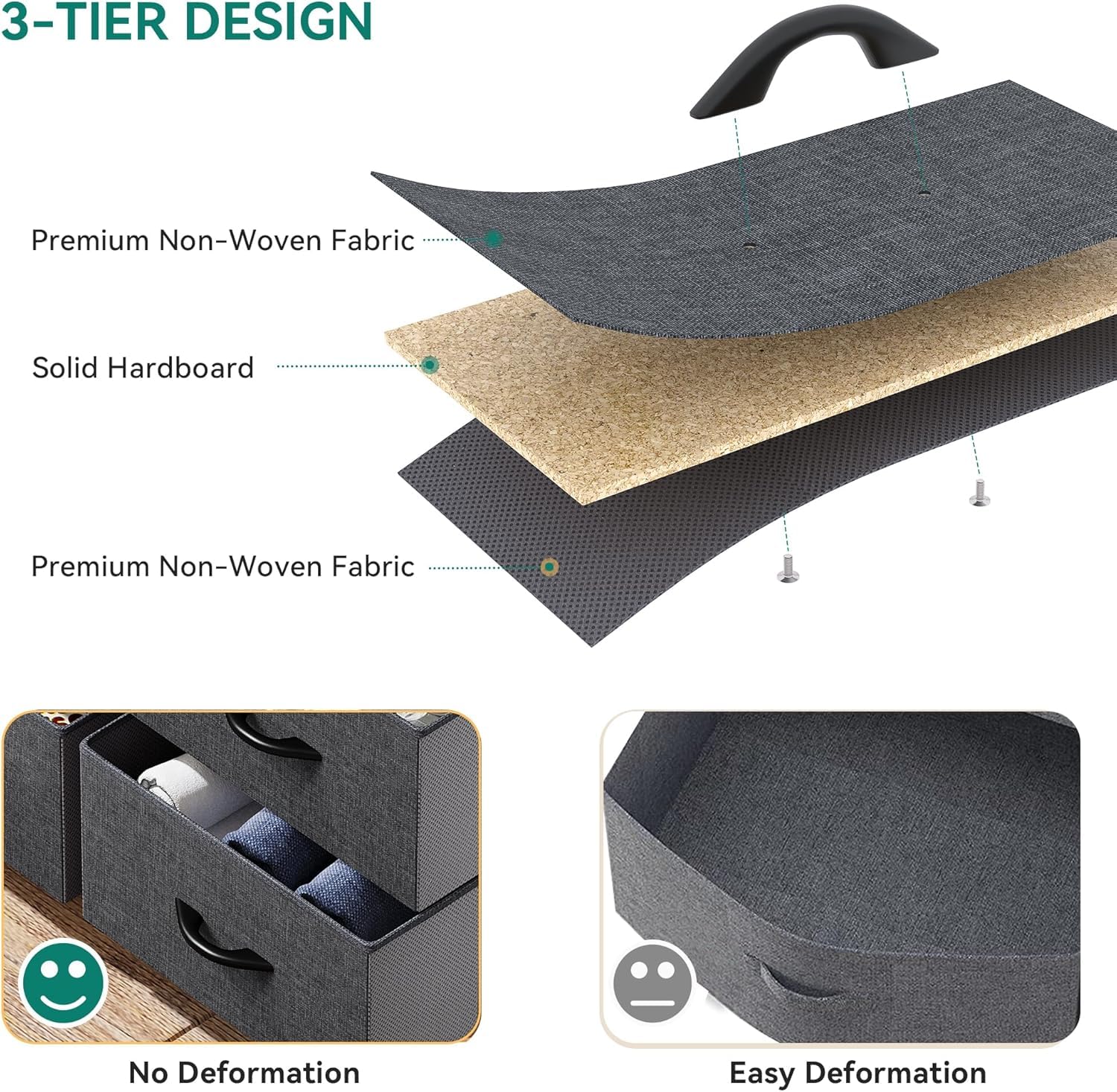 - DURABLE DRESSER – Built with a robust metal frame that provides solid support for the entire structure. The combination of a high-quality MDF wooden top and durable non-woven synthetic fabric ensures long-lasting strength and reliability.