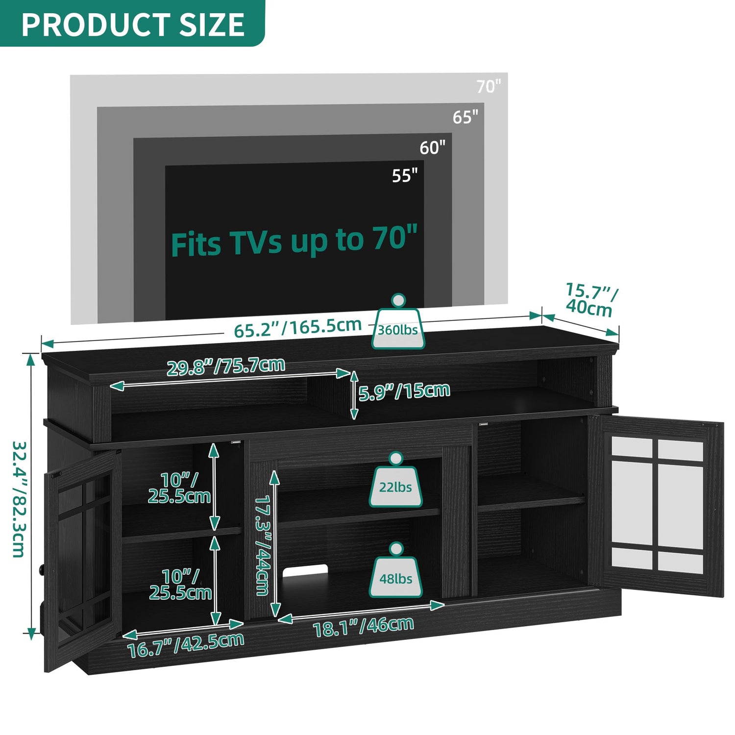- Durable Construction: Crafted from sturdy engineered wood, this TV stand ensures stability with a tabletop weight capacity of 400 lbs and middle shelves capable of holding 50 lbs each. Say goodbye to worries about wobbling