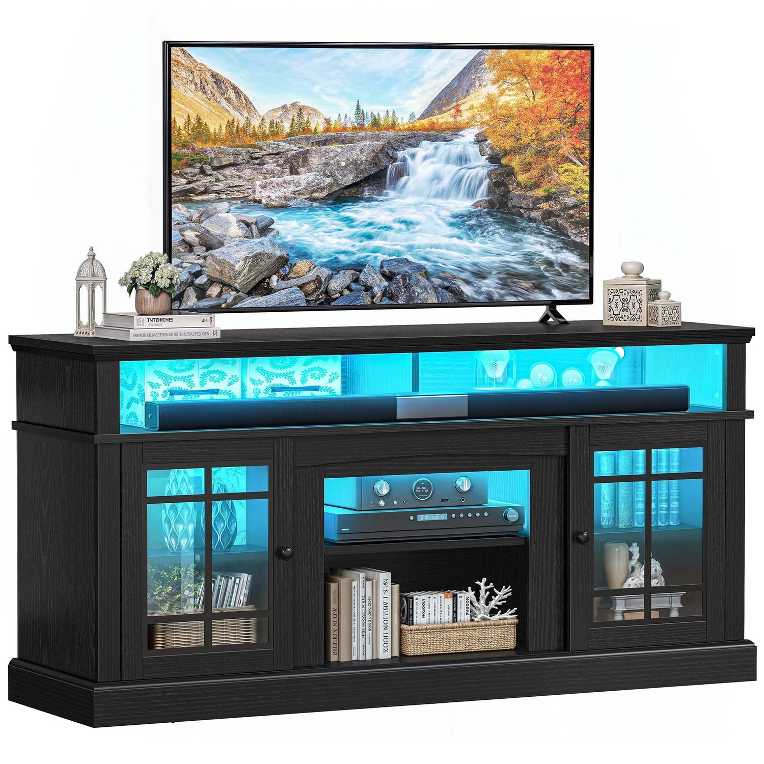 - Chic Farmhouse Design: Our farmhouse entertainment center blends glass side doors, robust particle boards, and a classic finish, seamlessly marrying tradition with modernity to add an elegant touch to your living space
