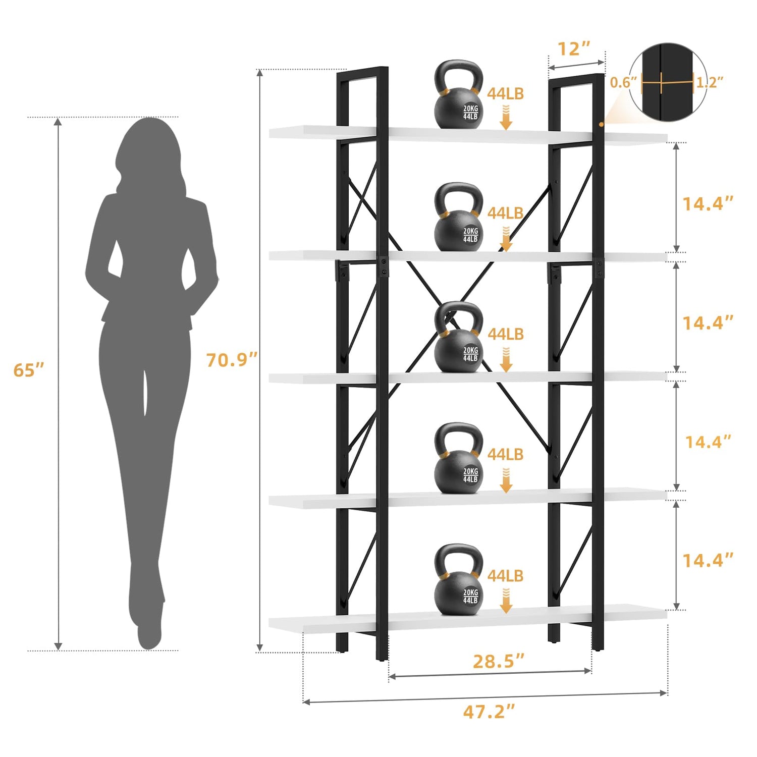 Introducing the YITAHOME Industrial 5-Tier Bookshelf, the ultimate combination of elegance and functionality for your home or office. With its generous dimensions of 12 inches deep, 47.2 inches wide, and an impressive 70.9 inches high, this large freestanding white storage unit provides exceptional space for all your organizing needs.