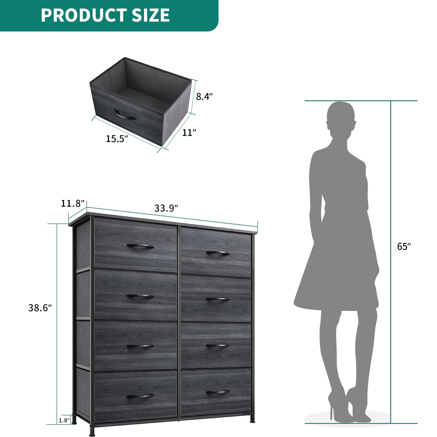 - LARGE CAPACITY- 8 drawers provide multiple storage options and ample room to make your living space neat and tidy; Overall Dimensions: 33.9" L x 11.8" W x 38.6" H. Drawer Dimensions: 15.6" L x 11.2" W x 8.5" H