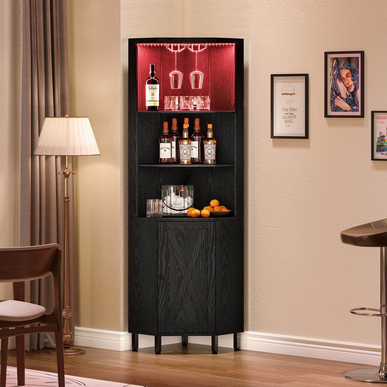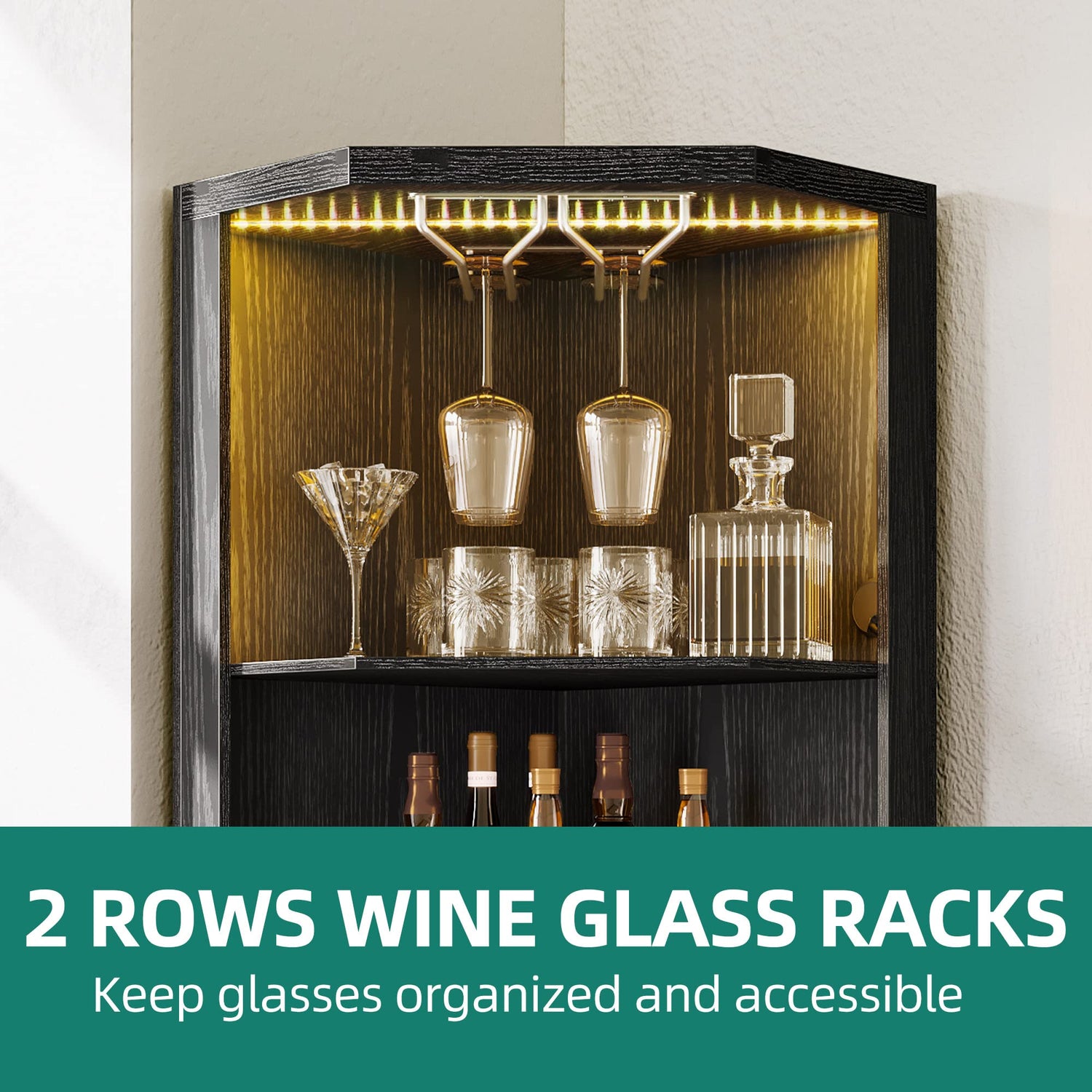 YITAHOME Black Corner Bar Cabinet with LED Lighting, Glass Holder & 5-Tier Storage Shelves