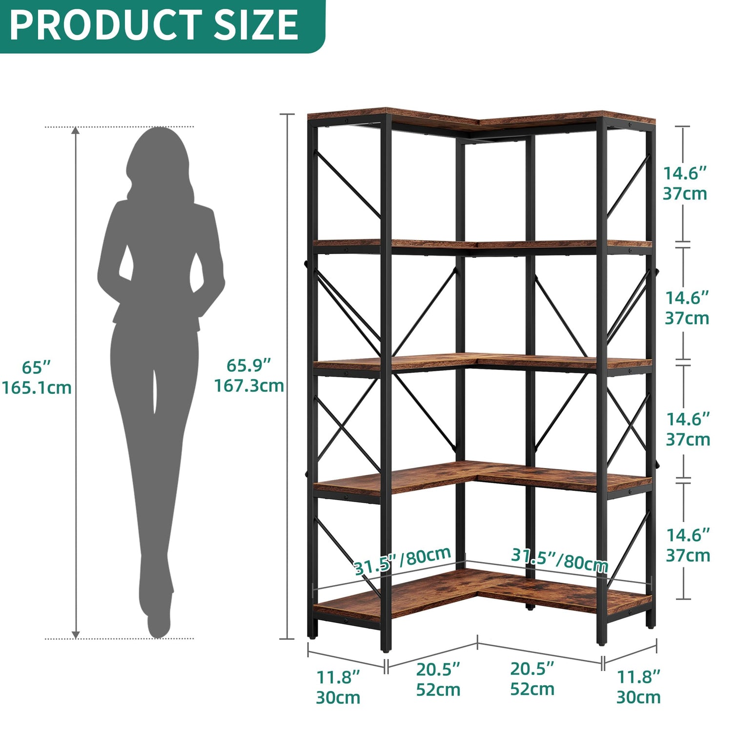 YITAHOME Corner Bookshelf, Industrial Corner Shelf 5 Tier Bookcase, Large Display Rack Storage for Bedroom, Living Room, Home Office,Rustic Brown