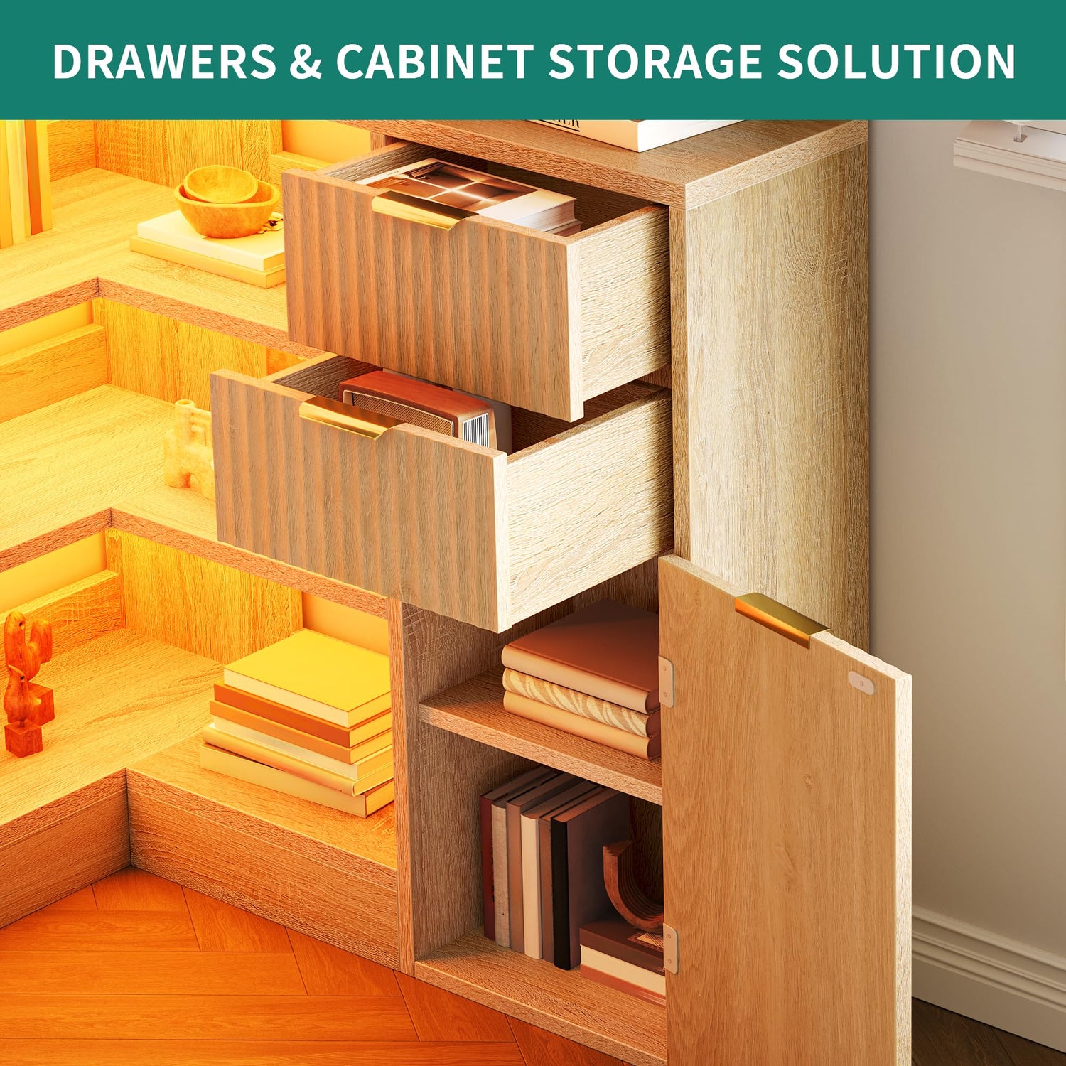 - Safe & Stable: Includes non-tip kit and leveling feet to keep your corner bookshelf with storage firmly anchored. Drawers feature built-in stoppers, and cabinet doors close securely with magnets, so everything stays in place just how you like it