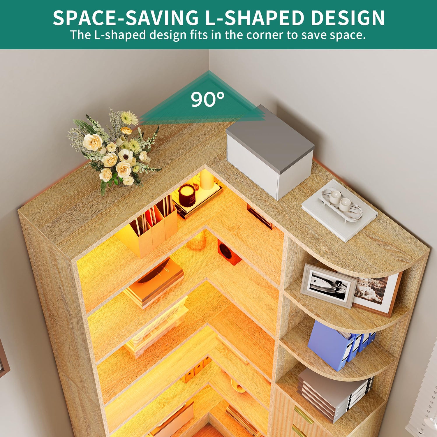YITAHOME Corner Bookshelf with Storage, Fluted 6-Tier Bookshelf with Drawers and Cabinets L-Shaped Bookcase LED Lights Corner Display Shelf for Home Office, Living Room, Bedroom