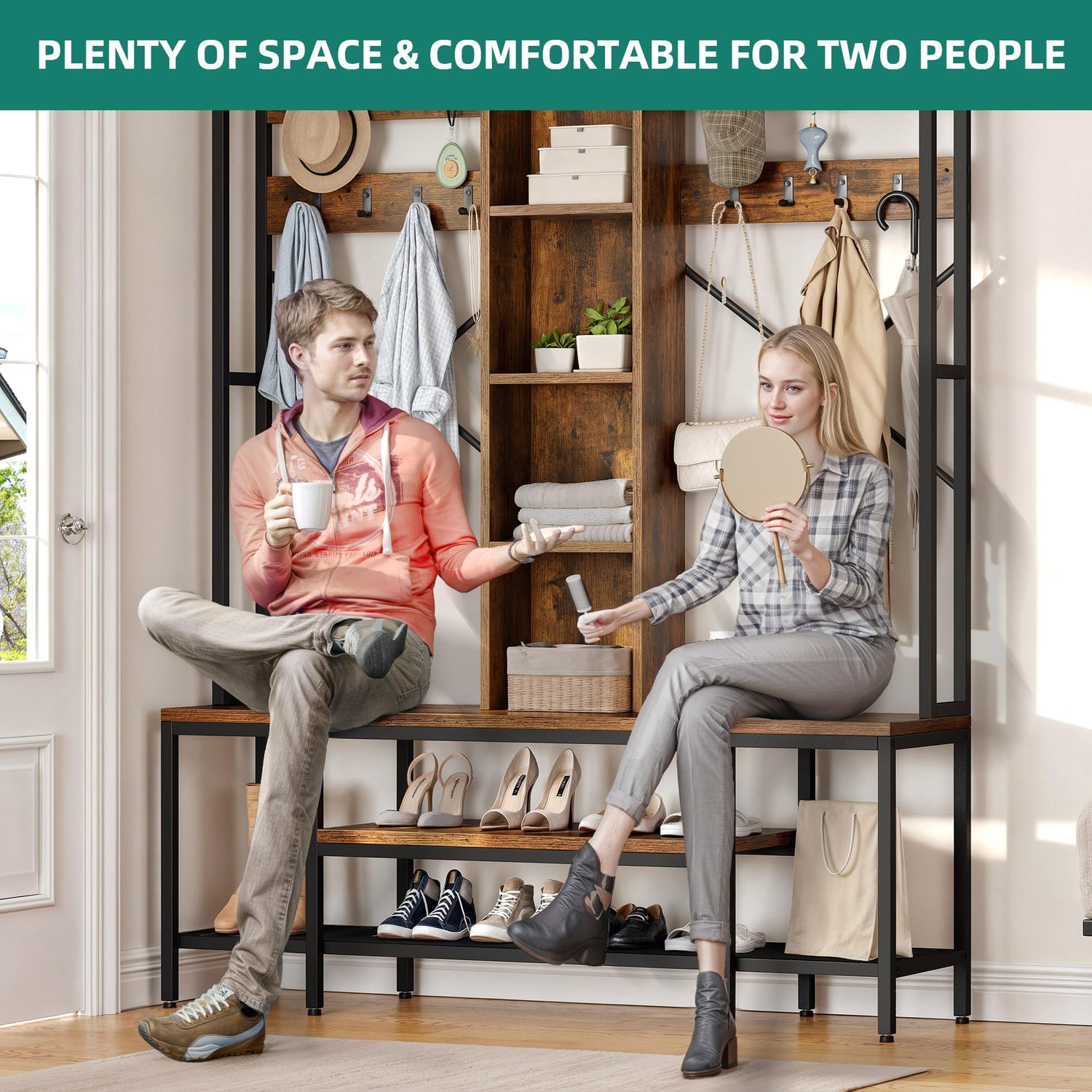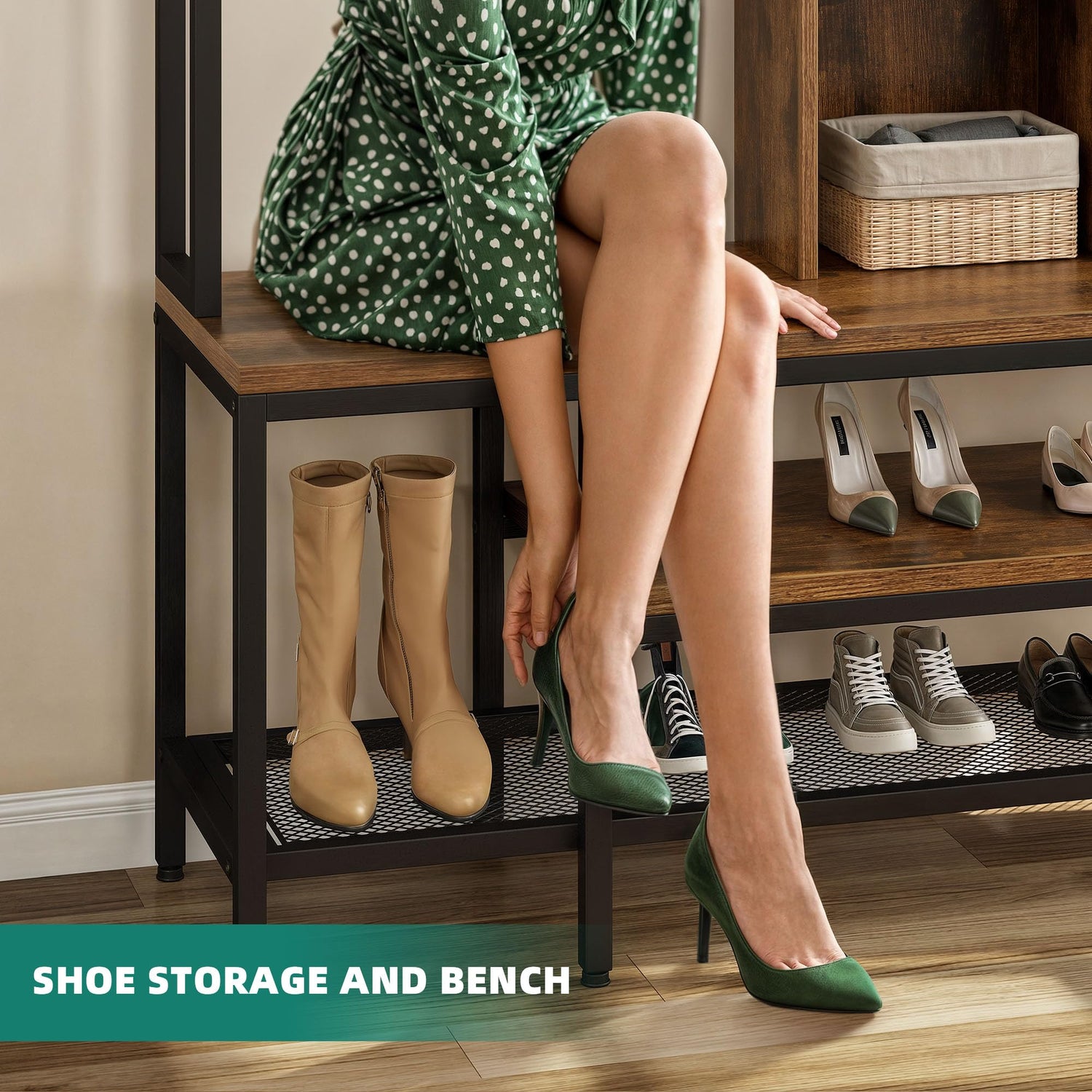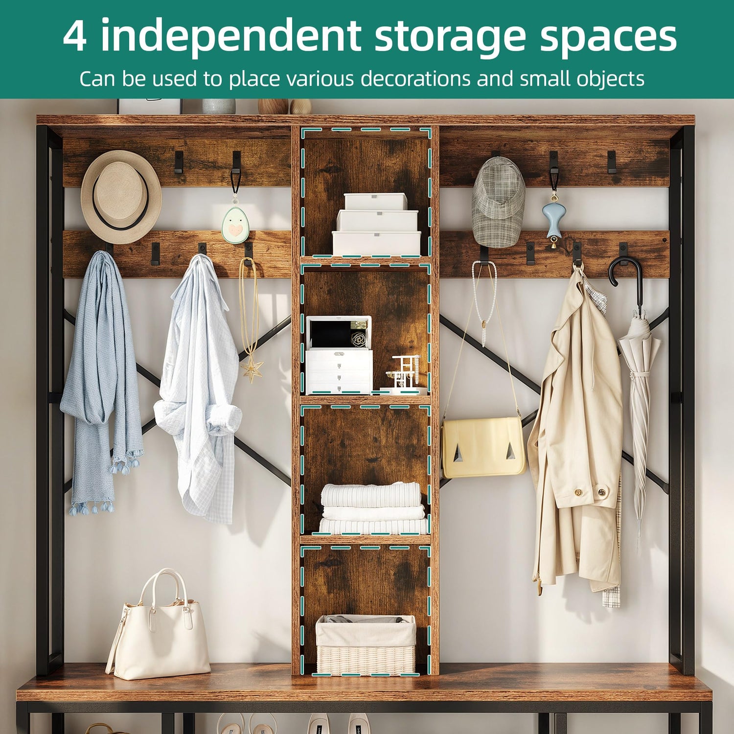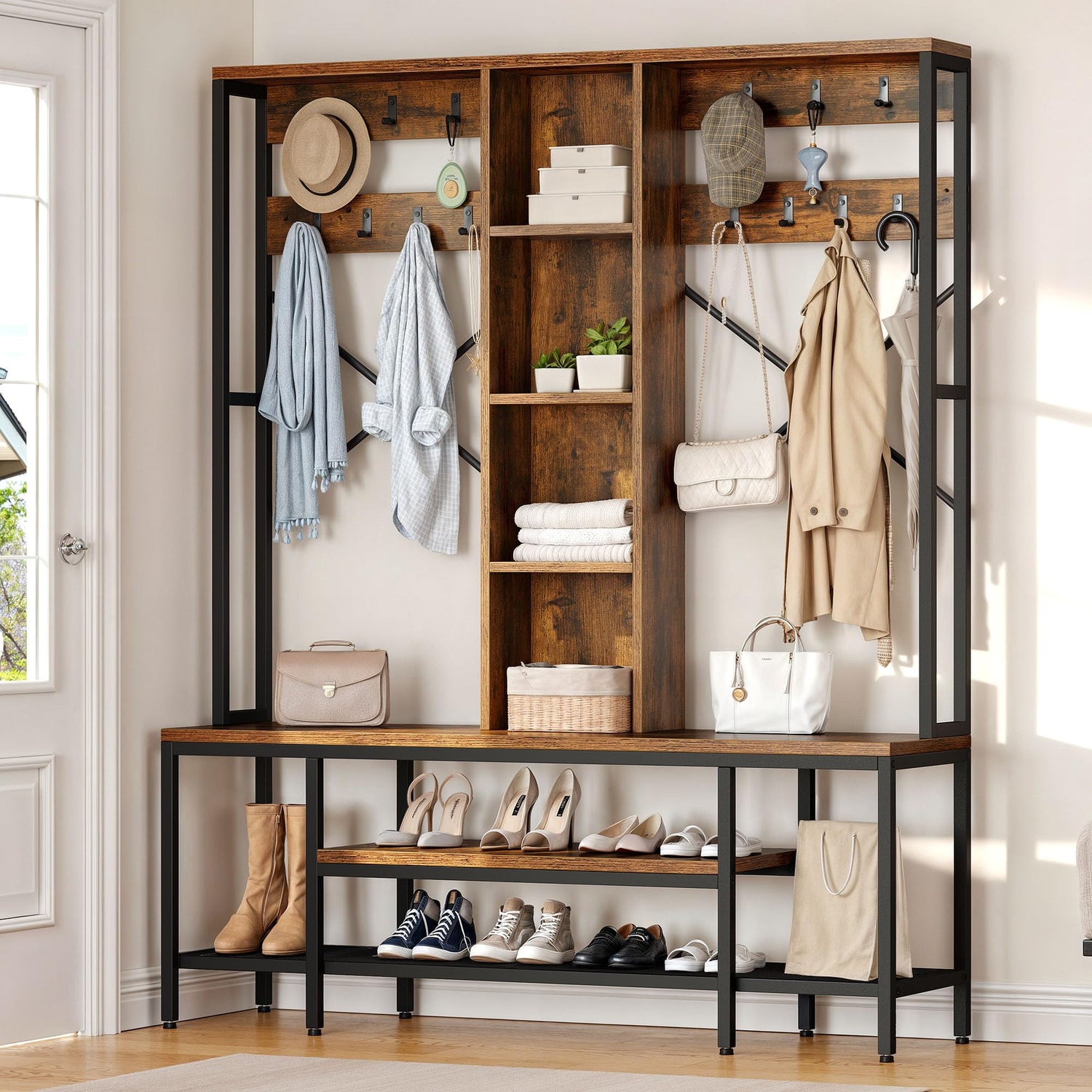 - 5-IN-1 Coat Rack: 5-in-1 design combines coat rack, shoe bench, shoe storage, 4 tier shelf and storage shelf for entryway organization. You can sit on the entryway bench to change your shoes and then put hang your coat on the rack. With this versatile piece of furniture, you can fulfill a variety of storage needs without multiple items.