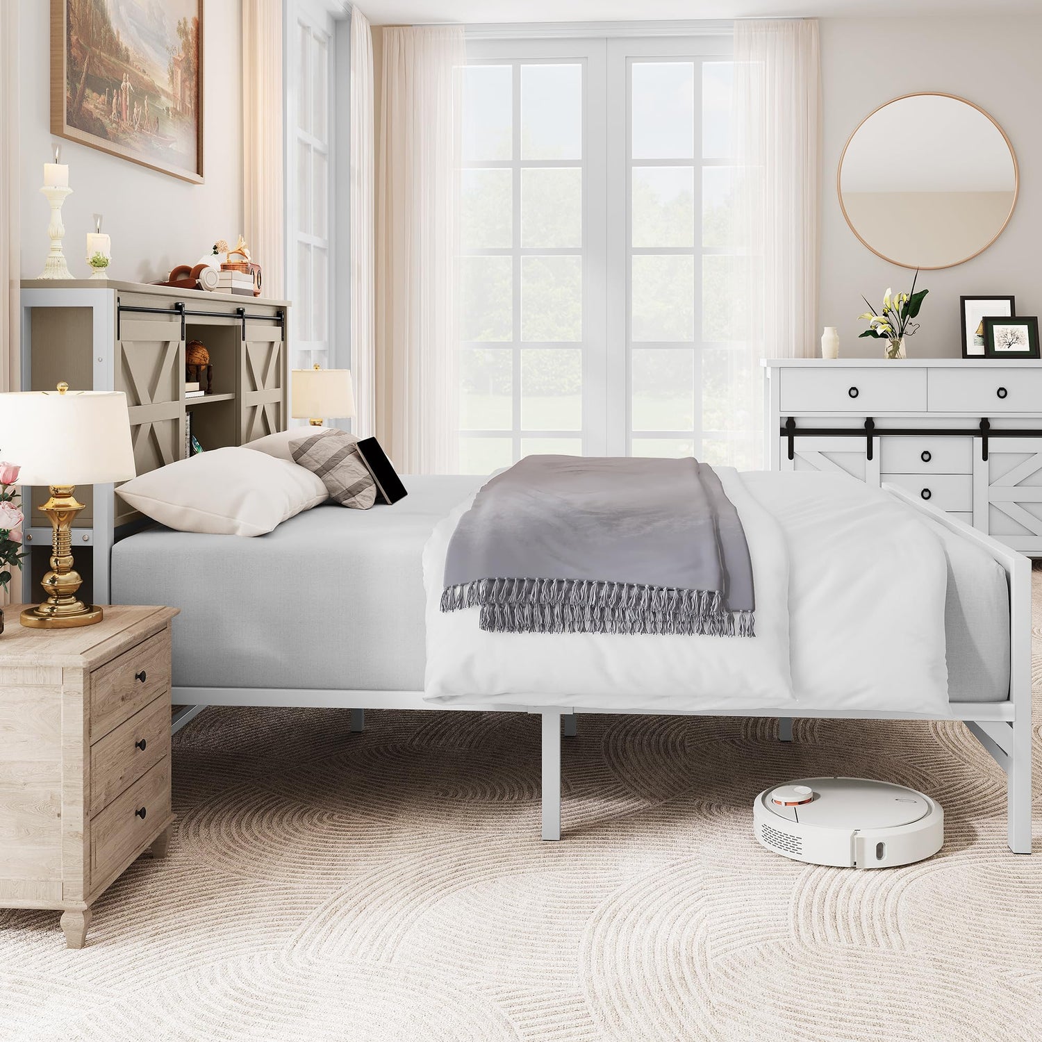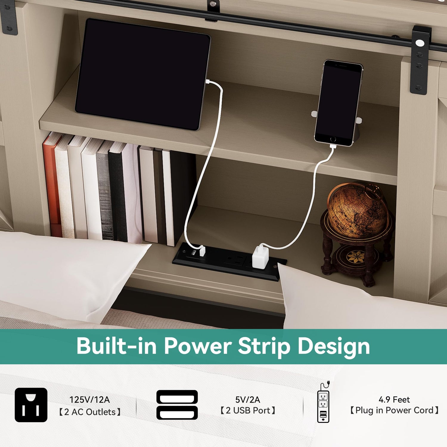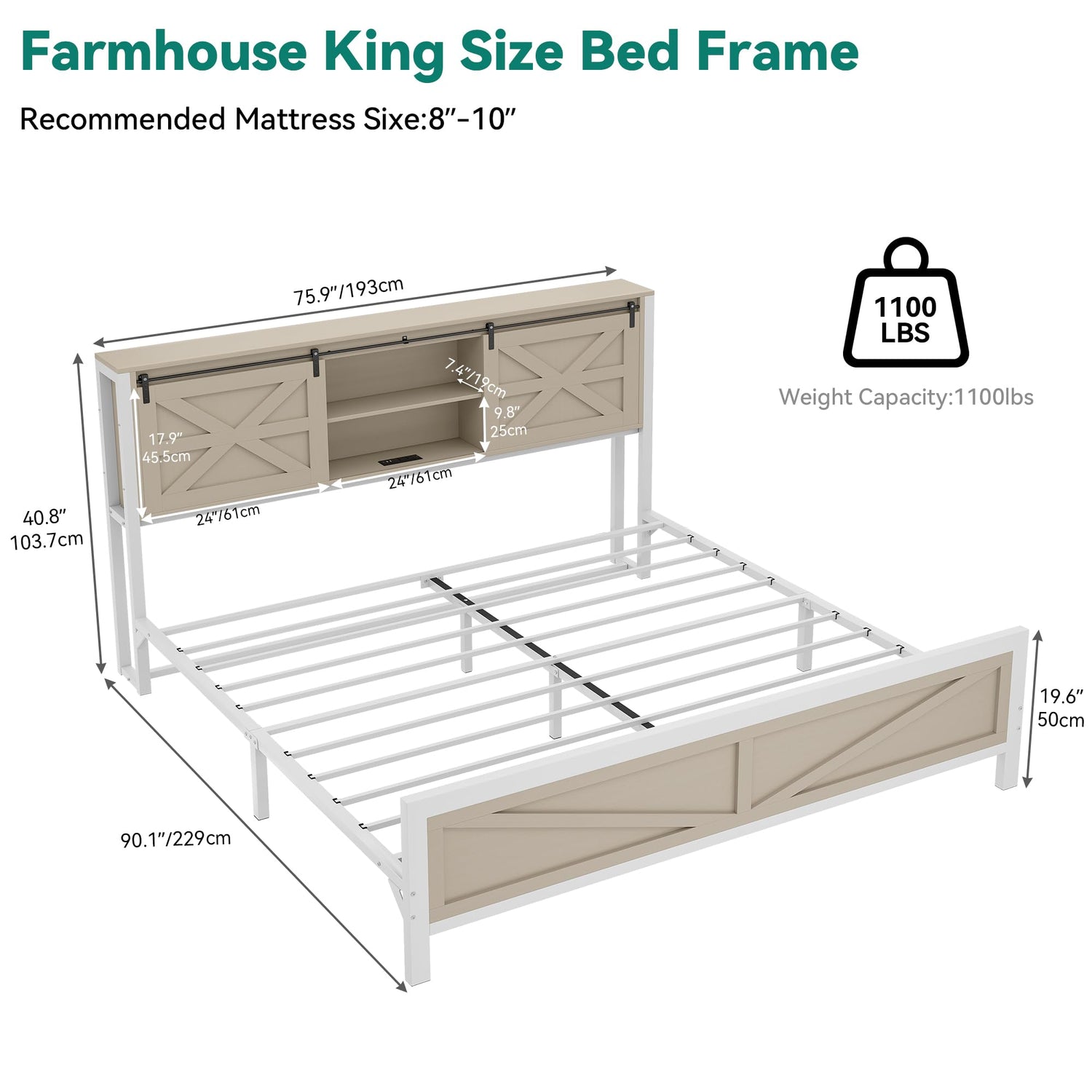 - Farmhouse Charm: This King bed frame combines a bookshelf headboard, sliding barn door system, and tall footboard to bring a classic farmhouse aesthetic to your bedroom, creating a cozy and inviting atmosphere.