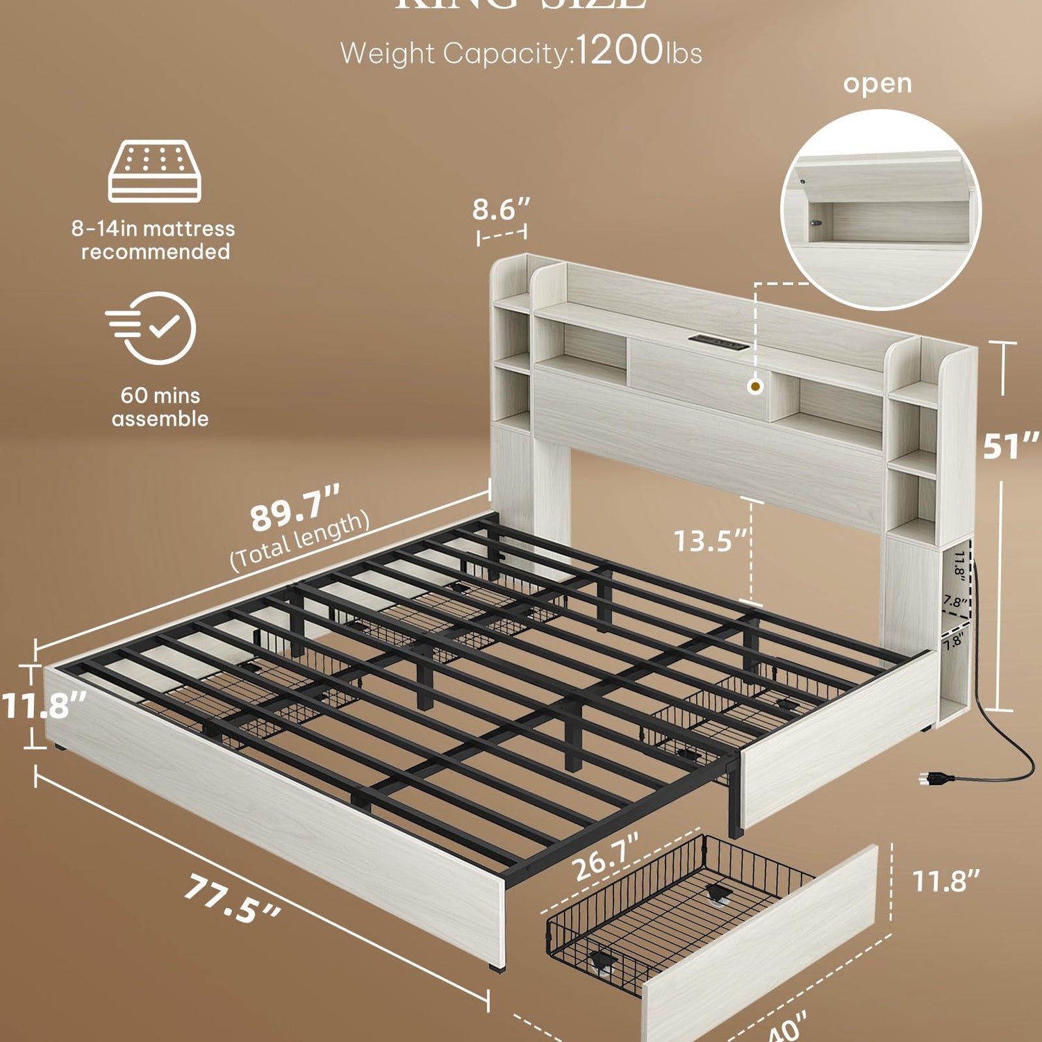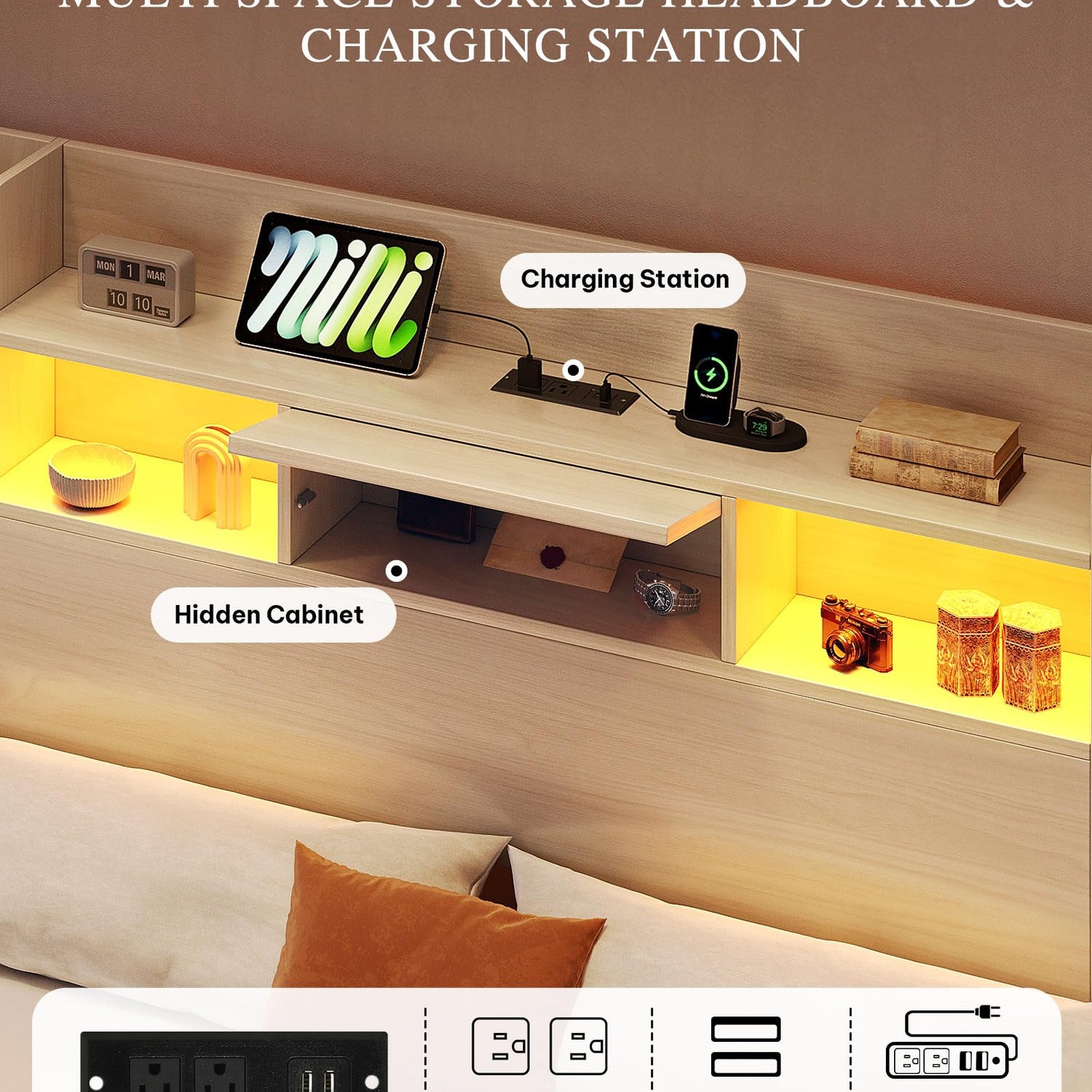 - BUILT-IN CHARGING STATION - The king size storage headboard bed frame built-in charging station, including 2 AC Outlets, a USB port and a type-C port, allowing you to charge various electronic devices within easy reach.