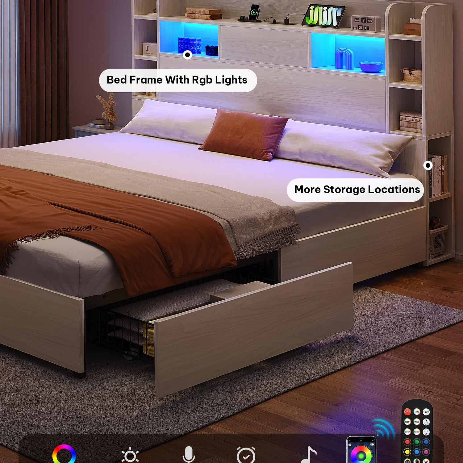 - RGB LED LIGHT BED FRAME - This storage headboard bed frame is equipped with RGB LED light , can be controlled by remote control or mobile app, more than 60,000 colors can be selected. You can freely set the brightness, color, mode and timing functions. Music Sync mode makes the rhythm of your LED lights flashing an immersive house concert experience.