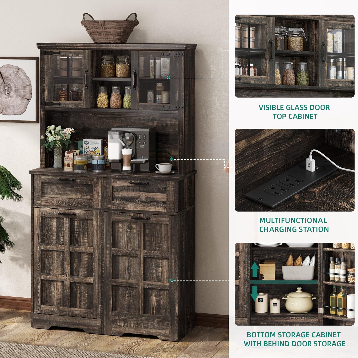 YITAHOME Kitchen Pantry Farmhouse, Tilit Out Trash Out Can Cabinet,Coffee Storage Bar Cabinet, 70" Tall Cabinet Cupboard with 2 Drawers, 2 Doors and Glass Display Case Shelf, Wheels, Rustic Dark Oak