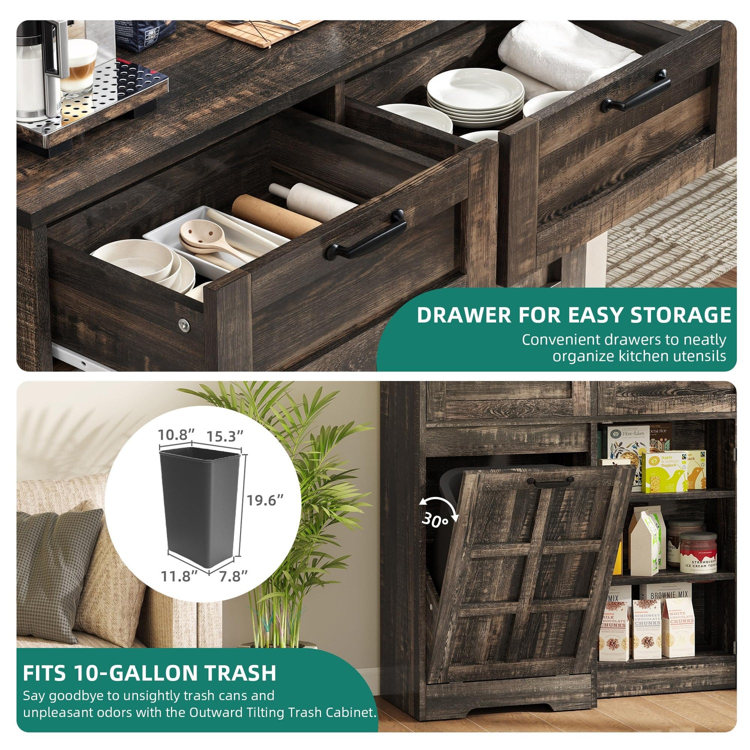 - Tide Up Your Kitchen: The concealed 10-gallon trash can ensures that kitchen waste is kept out of sight, maintaining a tidy appearance. This product is ideal for keeping your kitchen or living room clean and tidy. There is no need to dispose of waste outside, as the tilit out trash can provides a convenient solution. Transform your kitchen from disorganized to streamlined in a matter of minutes. Designed for placement in a variety of settings, including kitchens, living rooms, and dining rooms.