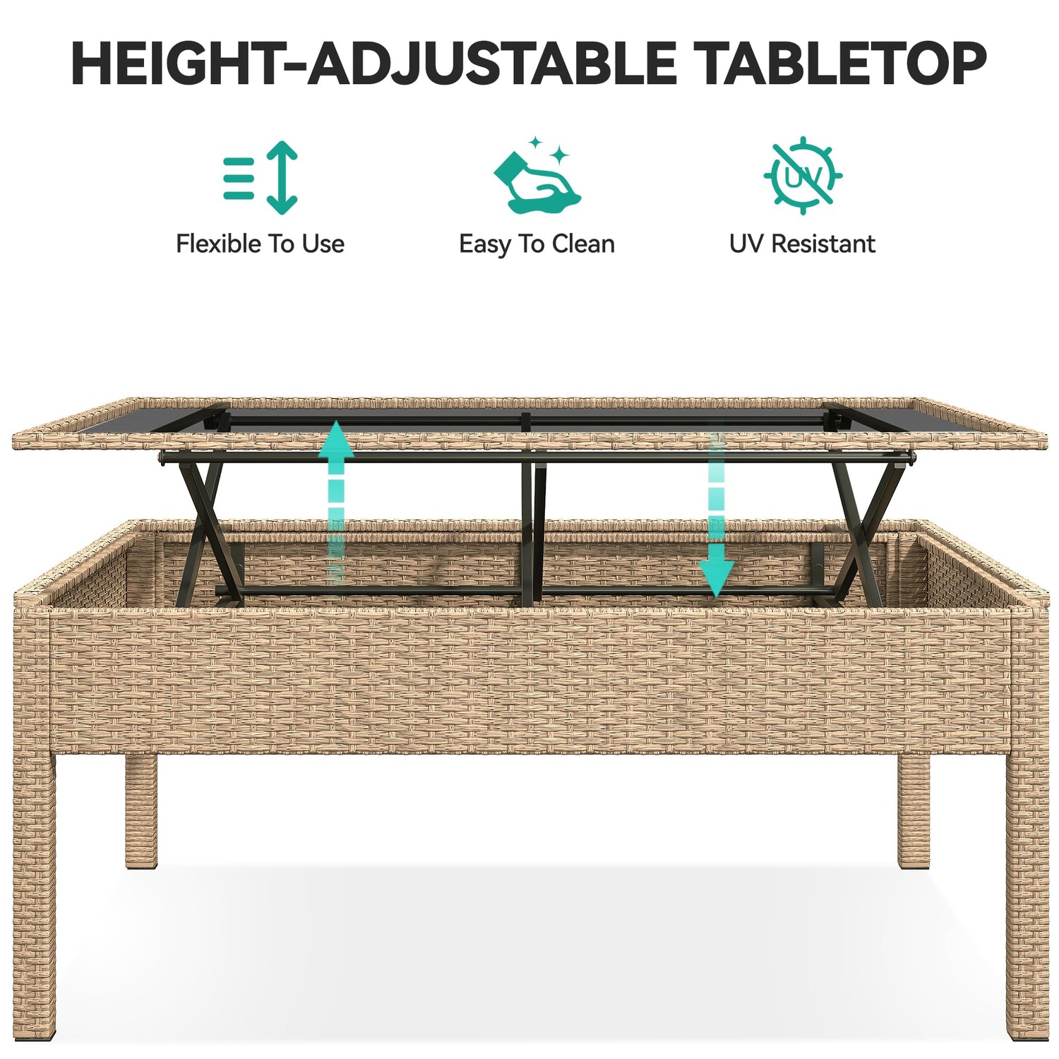 • Lift Top Table with Tempered Glass Top: Our outdoor furniture set boasts a special lift top table that satisfies your working, dining, or leisure needs; Tempered glass tabletop features ample space for drinks, food, decorations, etc., while adding an aesthetic touch to your space