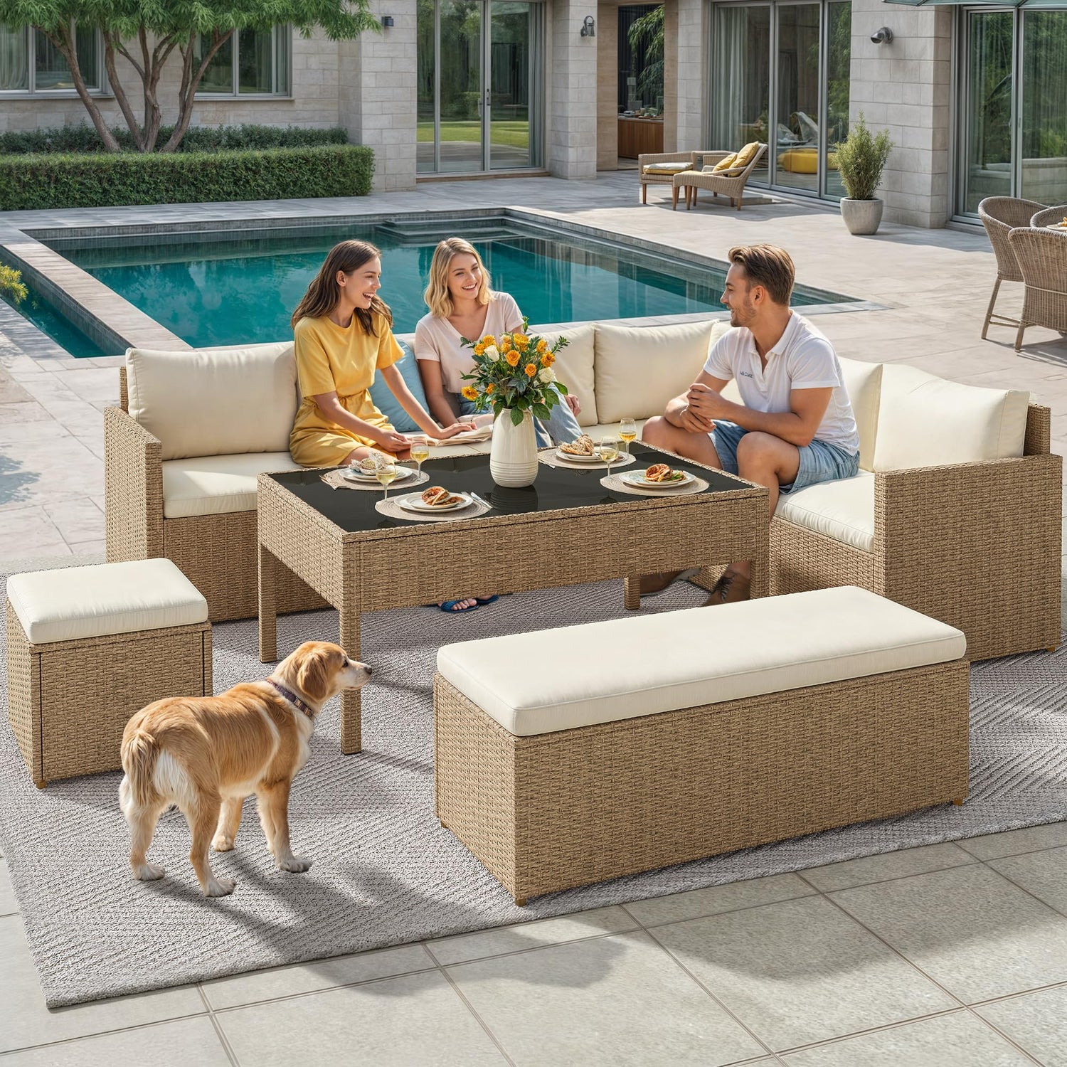 YITAHOME L-Shaped Patio Furniture Set, All Weather Wicker Outdoor Sectional Sofa Conversation Set with Dining Table and Ottoman, Light Brown+Beige