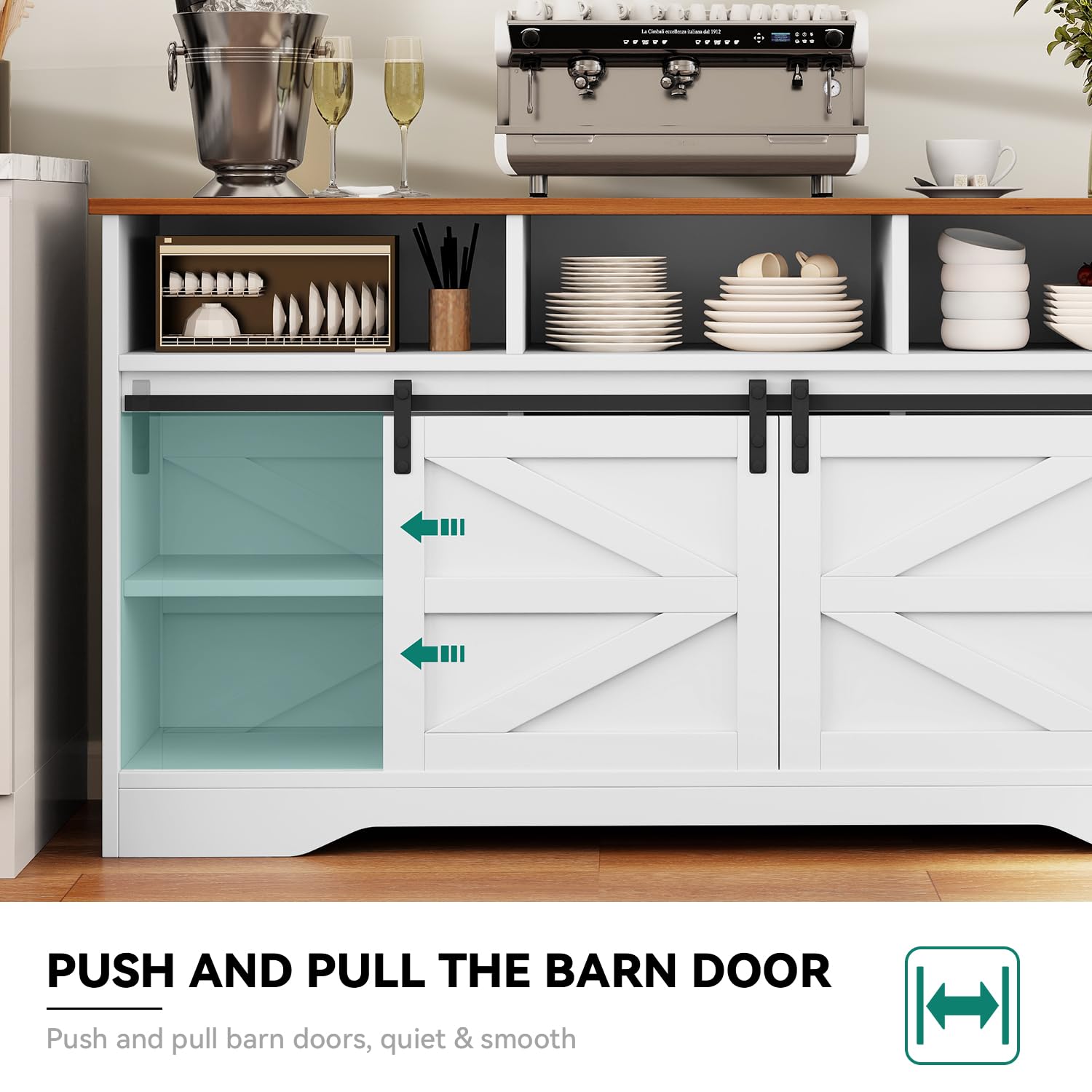 Details: Discover the perfect blend of style and functionality with our YITAHOME farmhouse buffet sideboard. This elegant buffet cabinet offers generous storage options including open shelves, spacious drawers, and adjustable shelves behind silent sliding barn doors. The 59'' countertop is ideal for kitchen essentials or decorative items, and can be transformed into a coffee bar, TV stand, or console table to suit your needs. Add rustic charm to any room in your home with this versatile and practical piece.