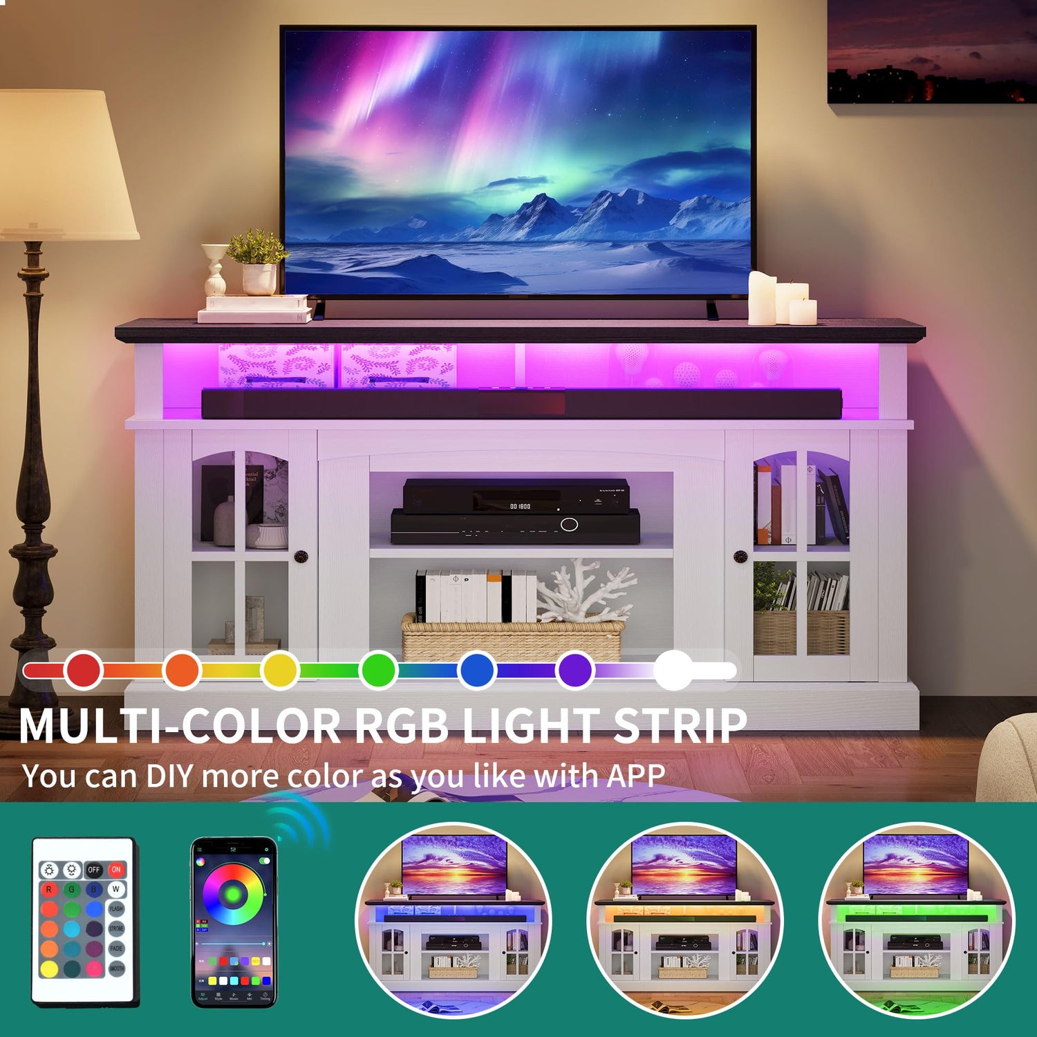 YITAHOME LED Farmhouse TV Stand for 65 Inch w/Outlets, Modern Entertainment Center with Glass Doors and Adjustable Storage Shelves, Media Console TV Cabinet for for Living Room, White/Black