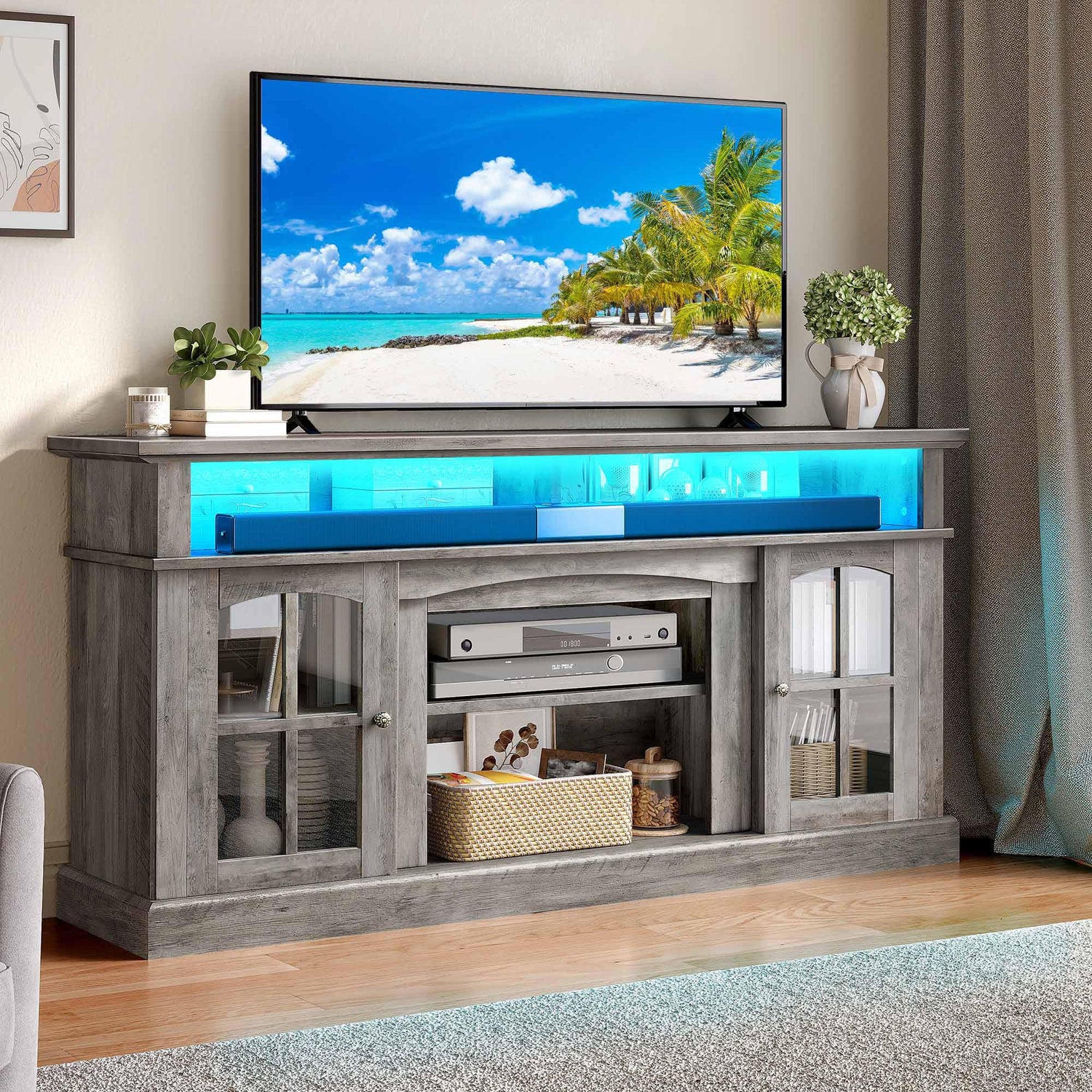 YITAHOME LED Farmhouse TV Stand for 75 Inch w/Outlets, Modern Entertainment Center with Glass Doors and Adjustable Storage Shelves, Media Console TV Cabinet for for Living Room, Grey
