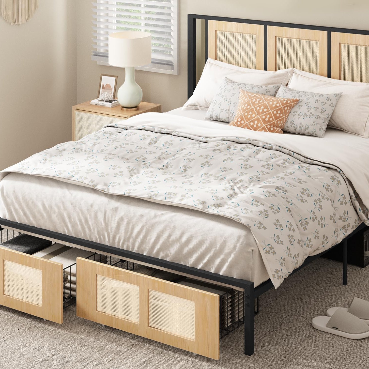 YITAHOME Natural Rattan Bed Frame Queen Size Headboard & Footboard with 2 Storage Drawers, Boho Cane Platform Bed with Strong Metal Slat, Noise Free, No Box Spring Needed