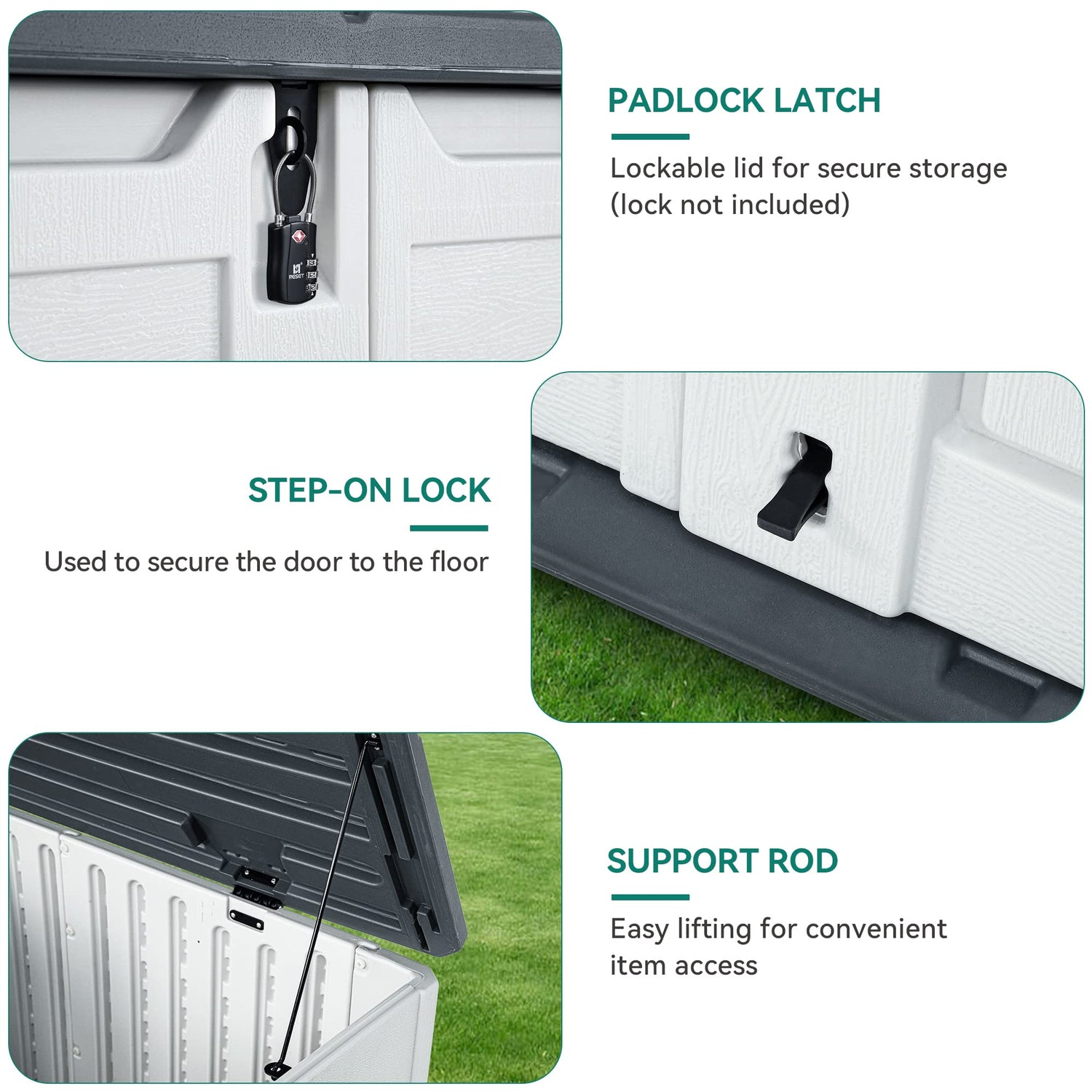 - ALL-WEATHER RESISTANT- This storage shed is made from weatherproof resin for UV protection, all-weather use, easy cleaning and maintenance; Alluring wooden texture will not fade and the innovative lid design keeps water out.