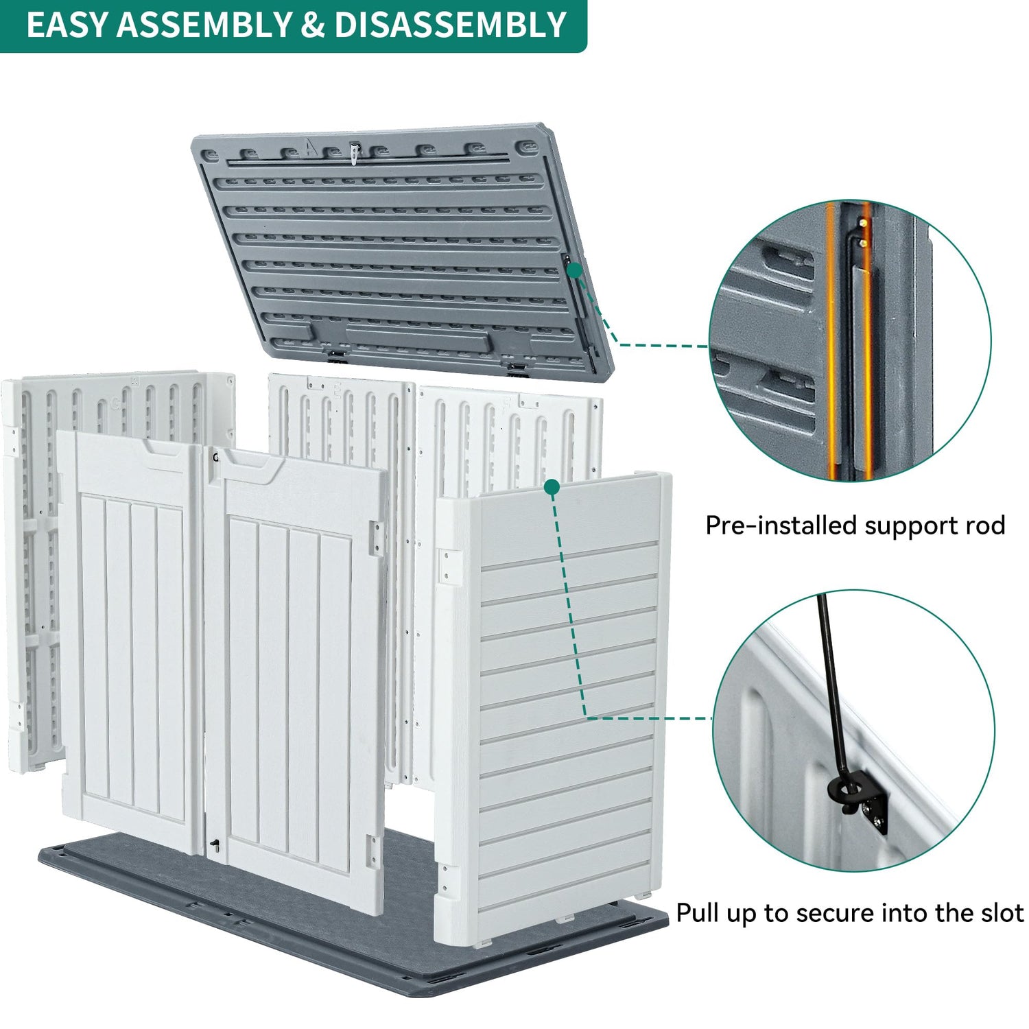 - LARGE STORAGE CAPACITY- Exterior is sized 51.1’’L*29.1’’W*41.3’’H, and the interior measures 47.2’’L*25.4’’W*39’’H; This plastic storage shed has a capacity of 27.05 cu ft; Suitable for storing gardening tools, lawn mower, bicycle, garden furniture, 2 x 34 gallon trash cans.