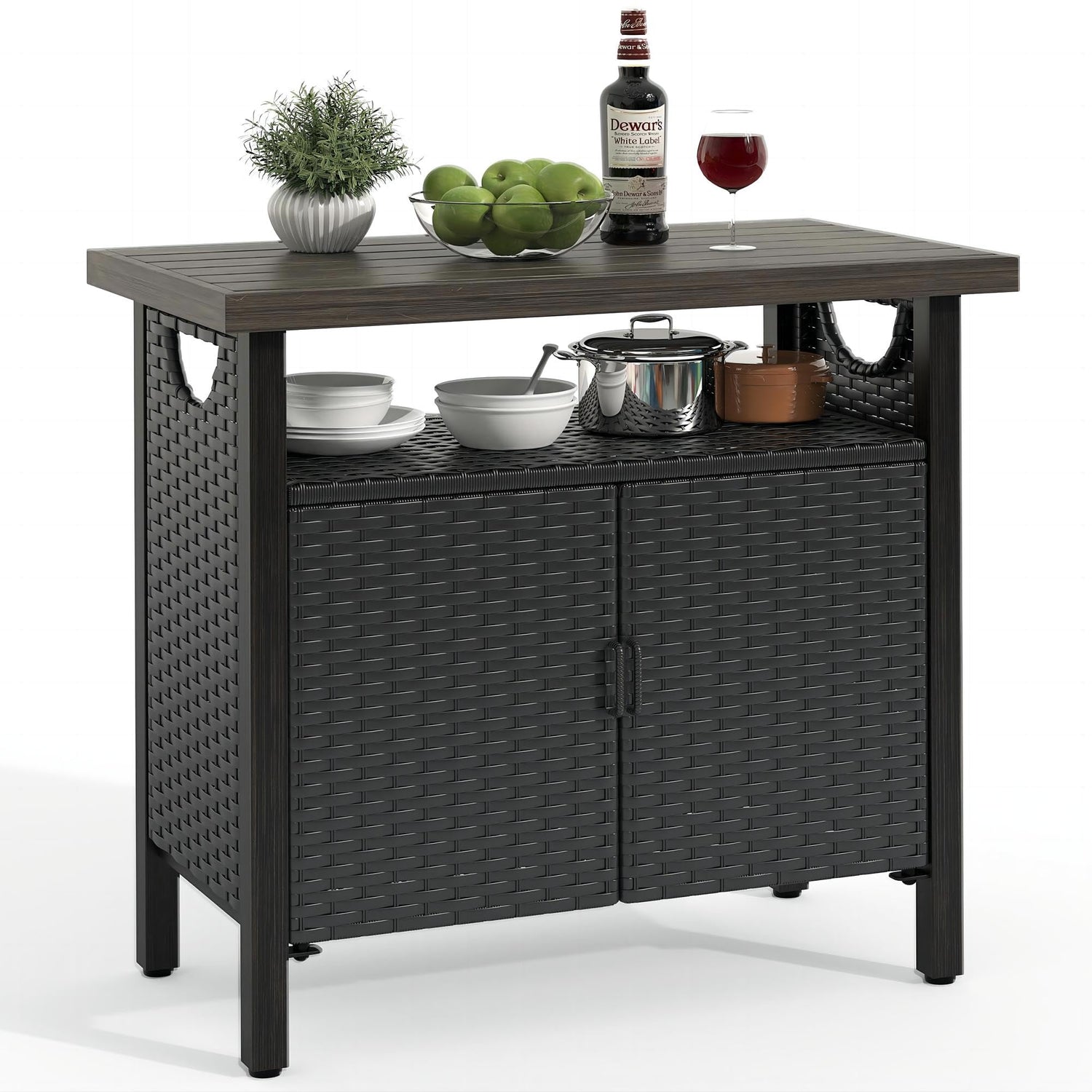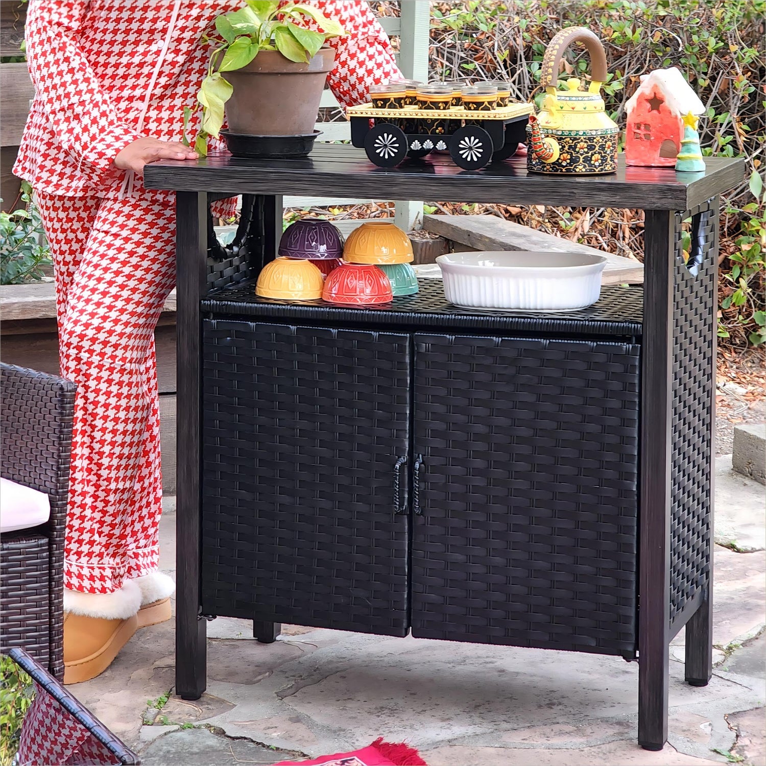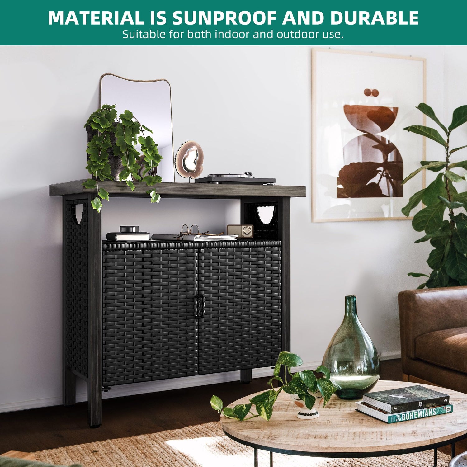 YITAHOME Outdoor Storage Cabinet, Patio Bar Table with Two Doors and Shelves, Weatherproof Wicker Storage Console Table for Outdoor Cushions, Pool Toys and Garden Potting - Black