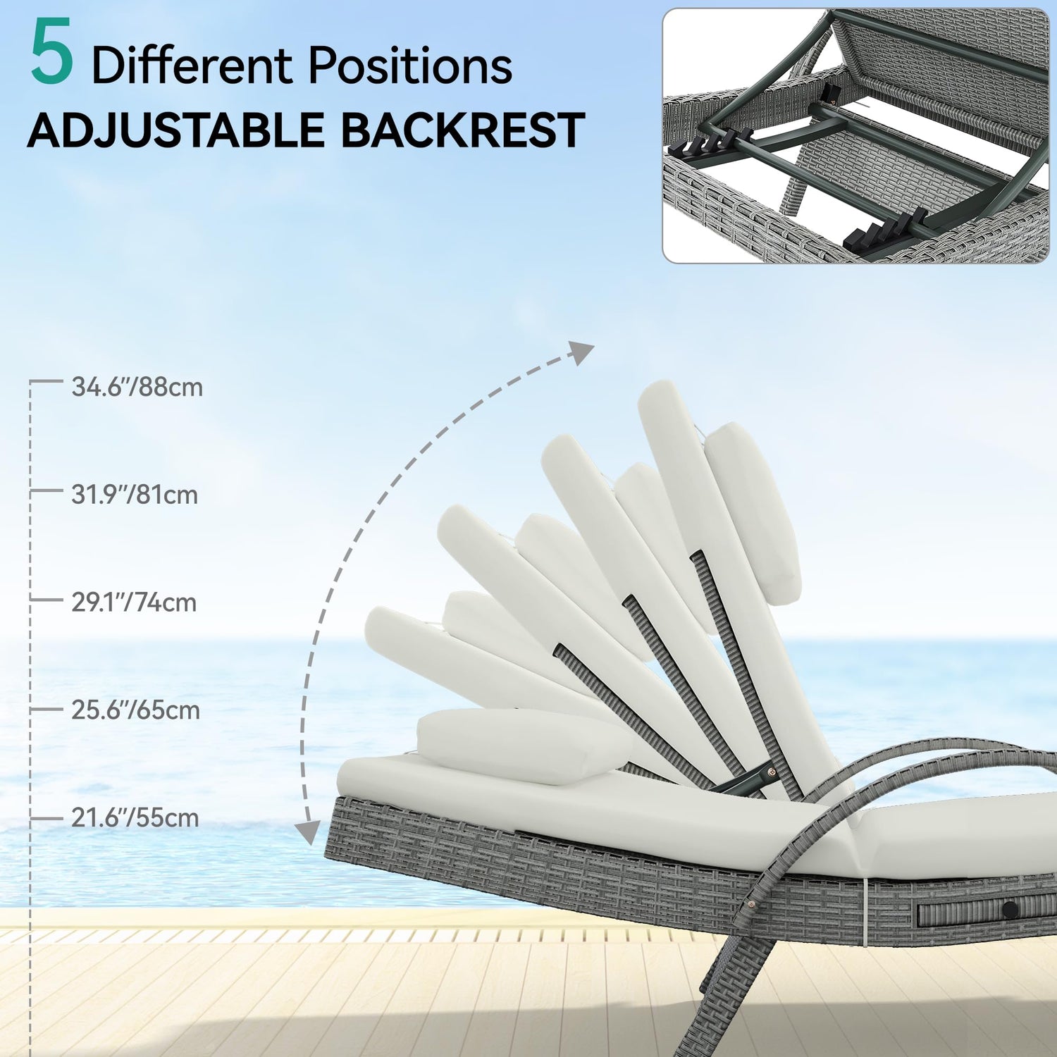 - 【Personalized Comfort】The rattan chaise lounge is designed with your comfort in mind; S-shaped backrest can be adjusted to five different angles, allowing you to find the ideal position for various activities such as reading, sunbathing, or simply relaxing