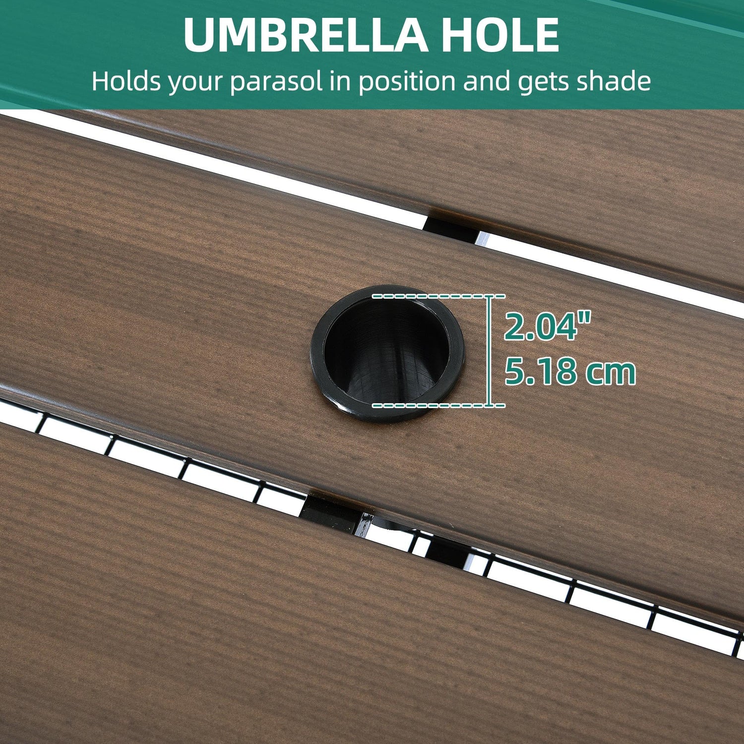 - Professional & Practical: This large outdoor picnic table is professionally designed to accommodate 4-6 people so it’s ideal for family and friends to enjoy outdoor picnics, camping, and parties. 2" umbrella hole is reserved on the tabletop, spearing your beloved and food from the bad weather. Hollow shelves underneath the table and chairs can hold lightweight items.