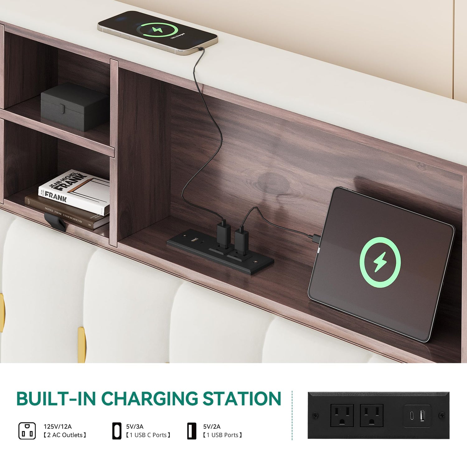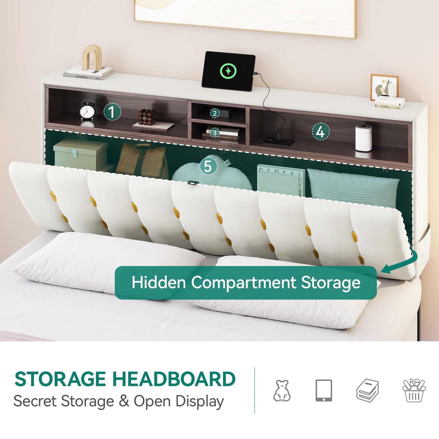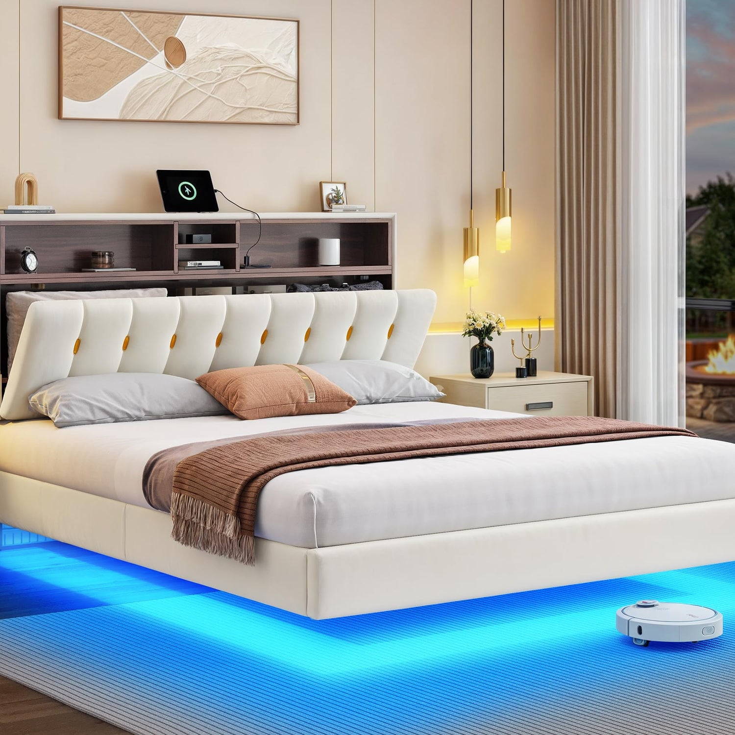 - Spacious Storage Solution: Queen floating bed frame's headboard and backrest provide versatile storage choices, featuring shelves with generous height and depth, ideal for organizing glasses, earphones, and personal items neatly