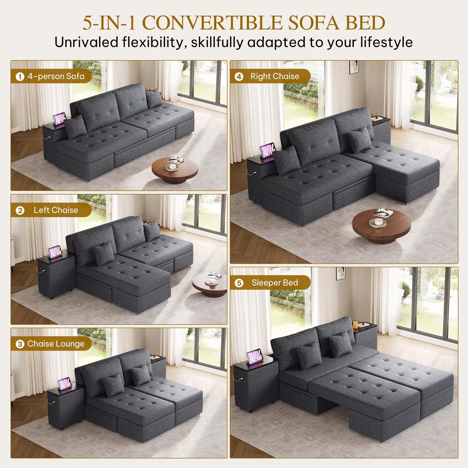 - 5-in-1 Convertible Queen Size Sleeper Sofa Bed: This sofa bed can be converted into 5 forms: 100" sofa, left chaise sofa, right chaise sofa, double lounge chair and bed with size 55" wide and 70" long. Just push the seat with wheels to complete the conversion smoothly