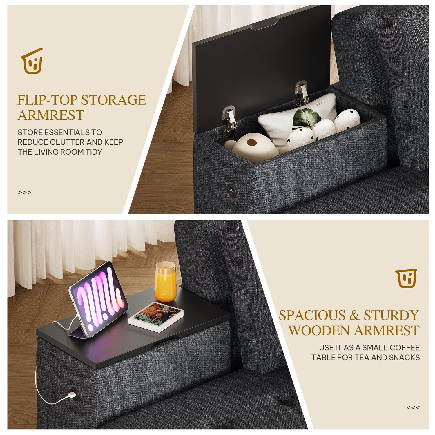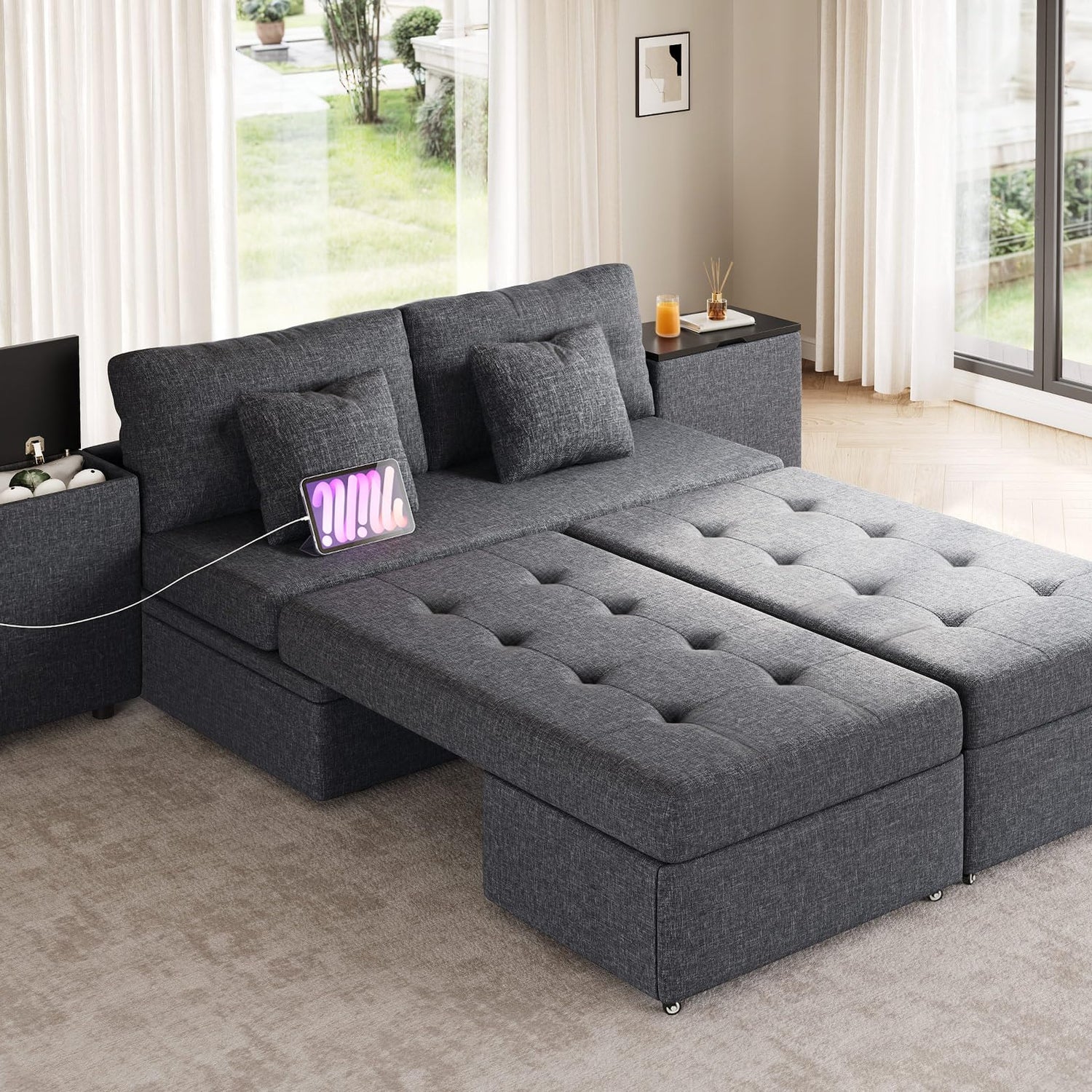 - Smart Design with Storage Cabinet Backrest: Two storage cabinets can be used as backrest in the sofa form, and the 110" sofa is large enough for four people to use at the same time. In the bed form, it can be used as two bedside tables for storage and to place some commonly used items on the desktop