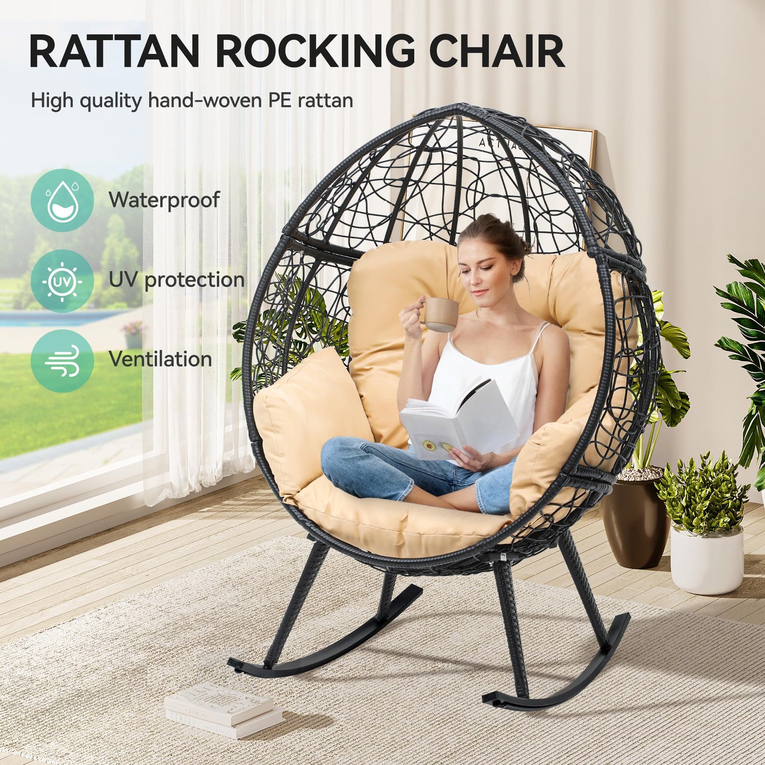 YITAHOME Rocking Egg Chair with Cushioned Comfort, 250lb Capacity, Anti-Slip, All-Weather Resilient Wicker Rattan Design for Indoor & Outdoor Relaxation Spaces, Beige