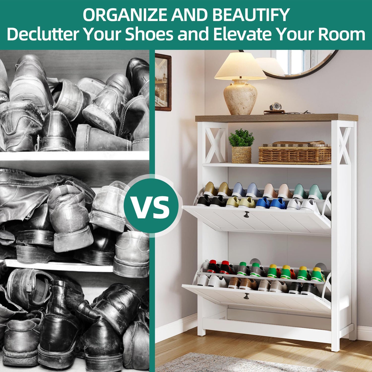 - Keep shoes organized & protected: The shoe cabinets with 2 flip shoe drawers can hold 12 to 16 pairs of shoes (depending on the size of your shoes), protecting them from dust. 2-position adjustable & removable dividers fit most of your shoes. Say goodbye to messiness.
