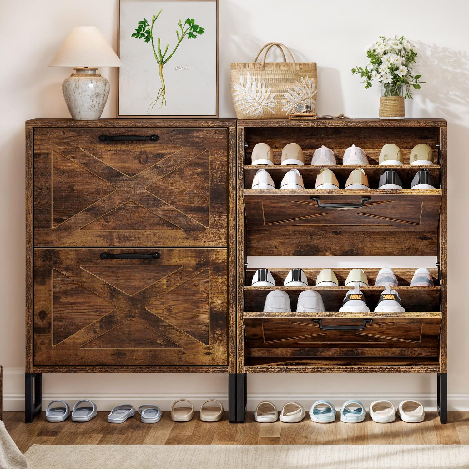 YITAHOME Shoe Storage Cabinet Entryway, 2 Flip Drawers Freestanding Organizer With Metal Legs, Narrow Storage Rack Cabinet, Rustic Brown