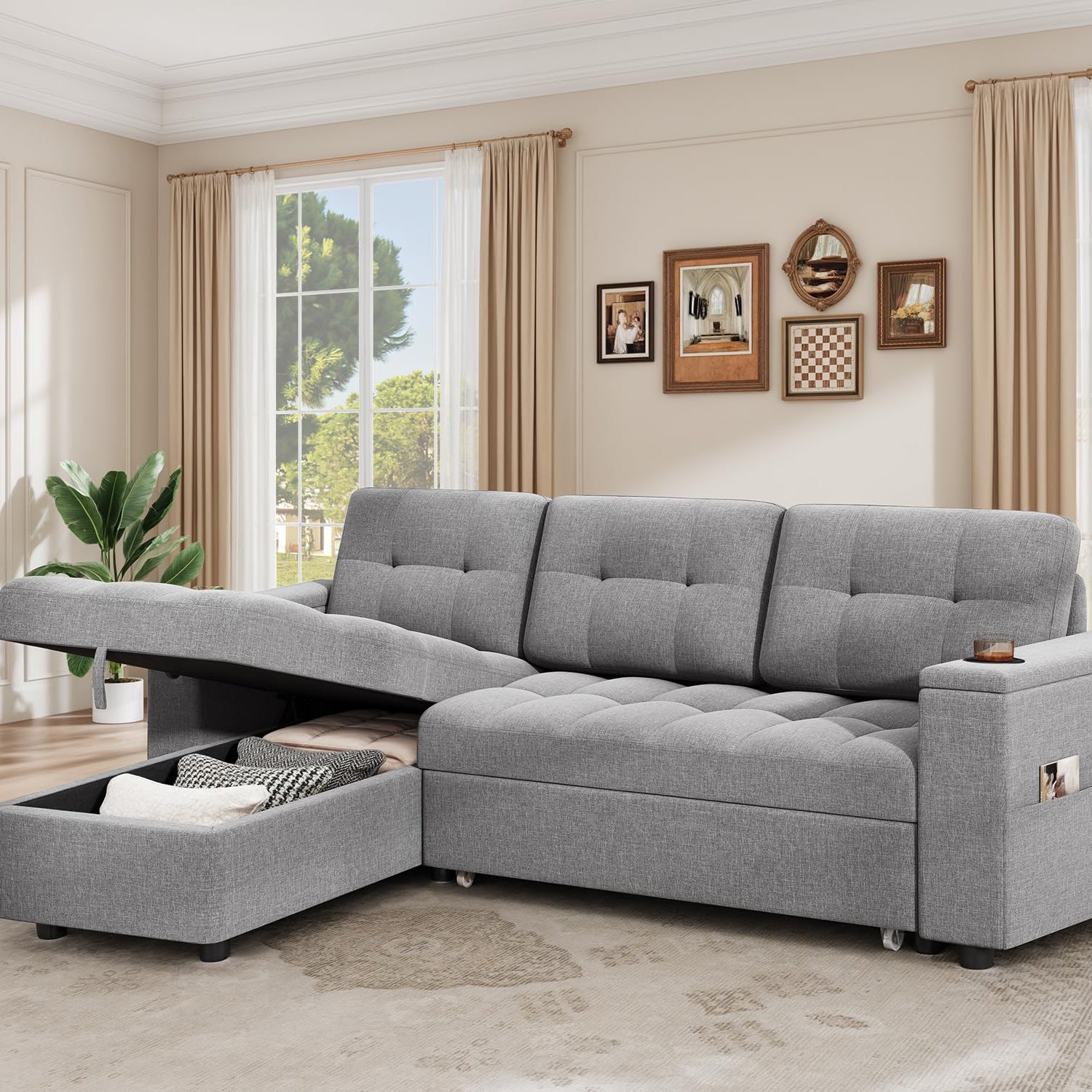 YITAHOME Sleeper Sofa, L-Shaped Sofa Couch w/Chaise & USB, 4-seat Fabric Convertible Couch Bed w/Pull Out Bed & Storage, Reversible Sectional Sofa for Living Room, Light Gray