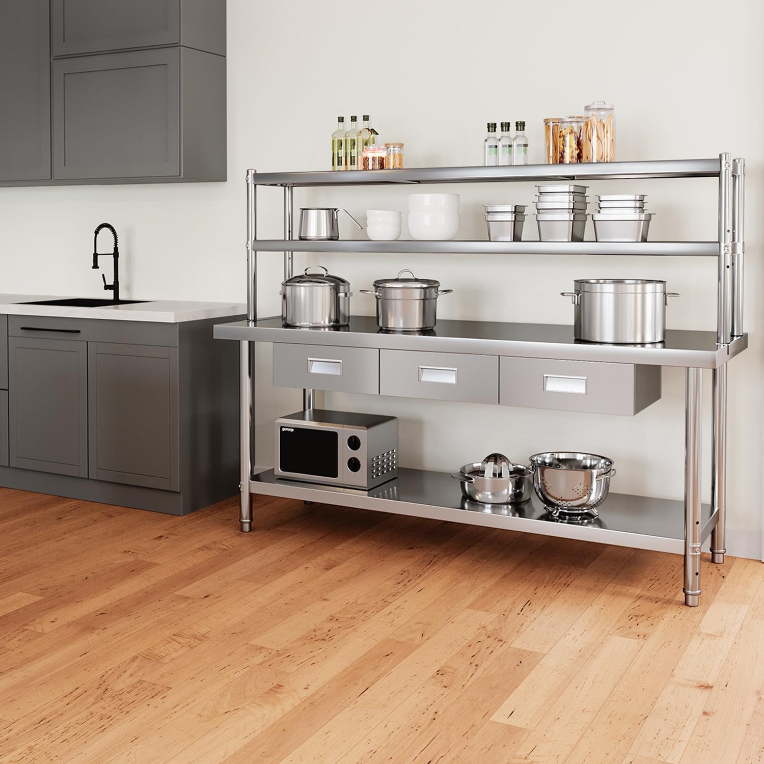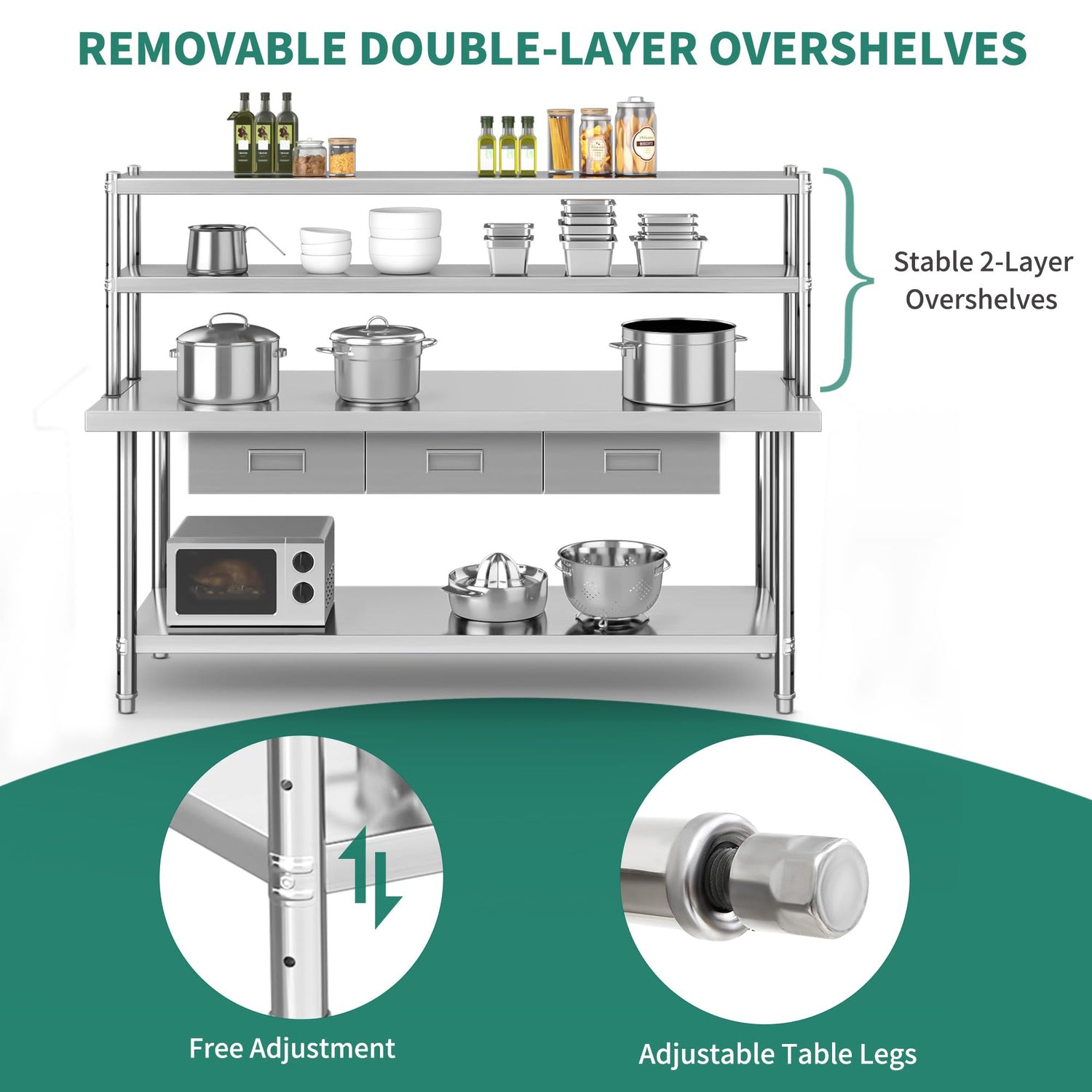 YITAHOME Stainless Steel Table with Overshelves & Drawers, 72" X 24" Work Table with 72" X 12" Shelf & 3 Drawers, Metal Table Prep Table