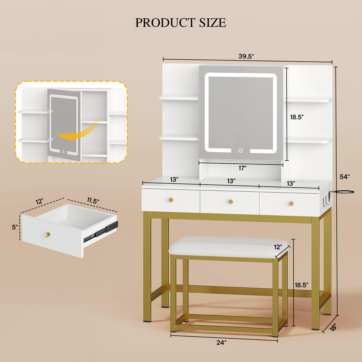 YITAHOME Vanity Desk with LED Lights Mirror & Power Outlets, Makeup Table Set with 3 Adjustable Lighting Modes, Open Shelves and Hidden Storage, Stool, Hooks and Hair Dryer Holder for Bedroom, White