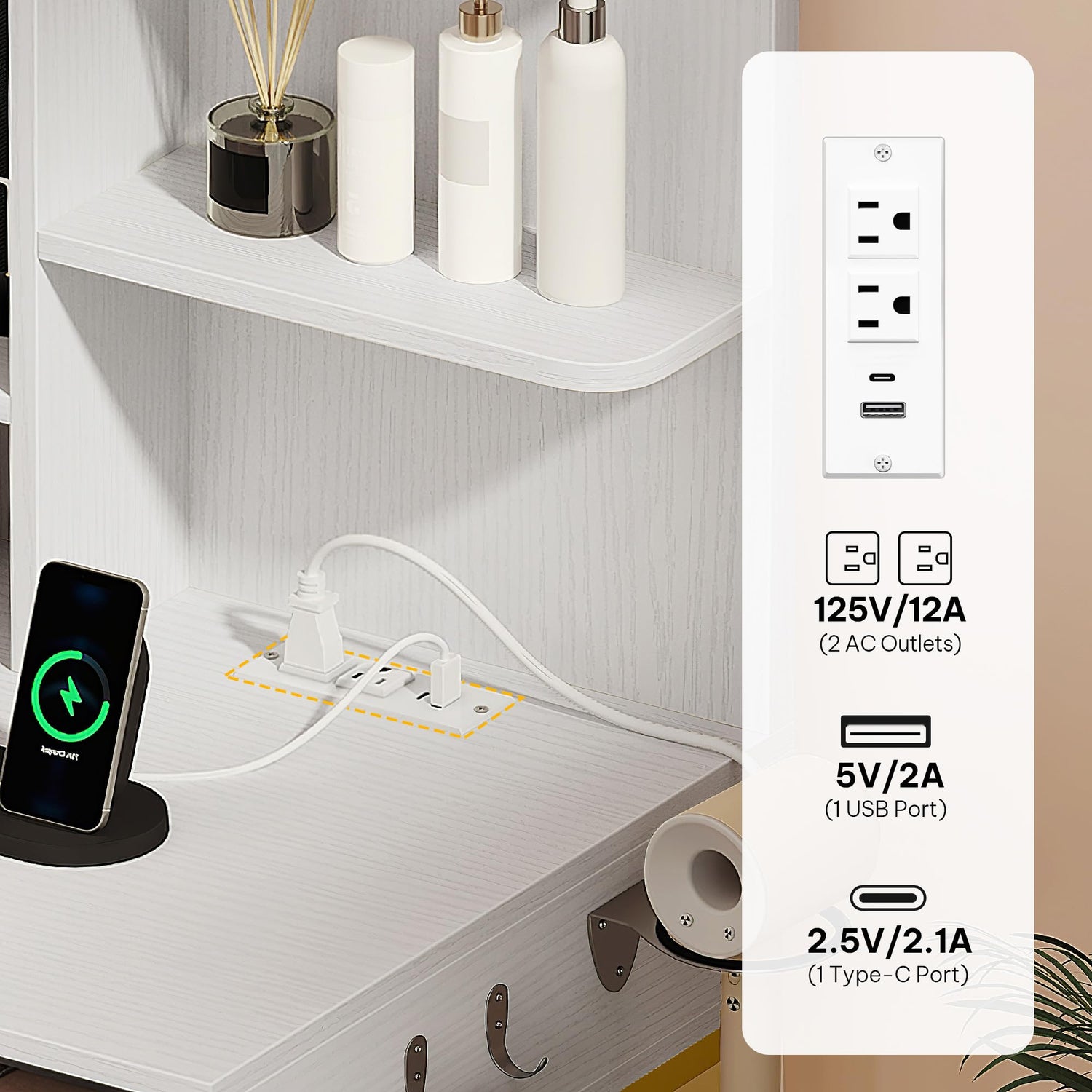 - Stay Powered & Sit Comfortably: Stay powered up with our modern dressing table set, featuring 2 AC outlets and 2 USB ports to easily charge your phone and beauty tools. The added stool ensures comfort as you enjoy your daily beauty routine