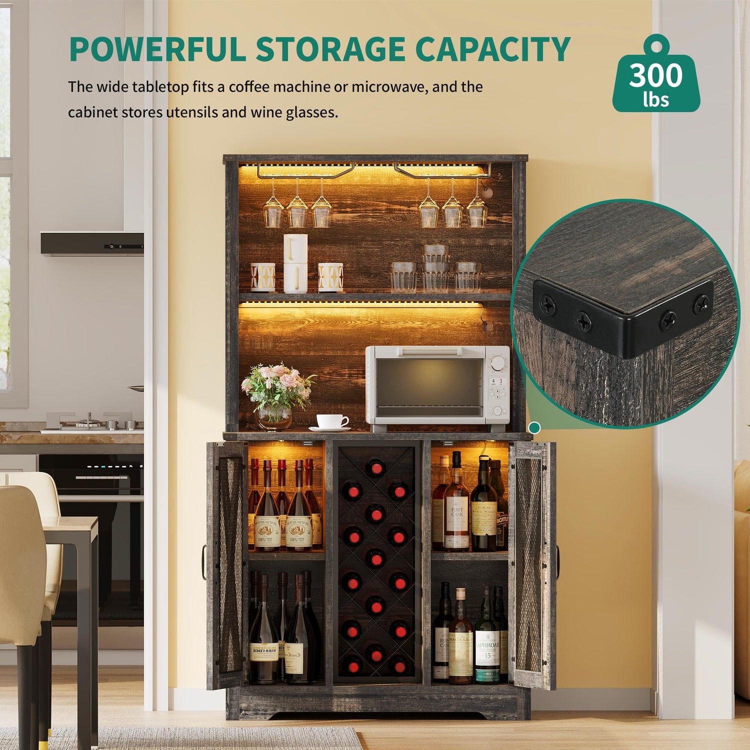 - Extra Large Pantry Storage Space:Wine bar cabinet features an integrated design that combines a wine rack, glass holders, storage shelves, and buffet cabinet. The upper shelf can display some coffee cups, wine glasses, or jars. It's wide countertop is great to store microwave, coffee maker, toaster or whiskey. And the bottom buffet has 2 adjustable shelves allow you can flexible to classify kitchen utensils, jars, snacks, liquor orderly. Meeting your family storage space needs!