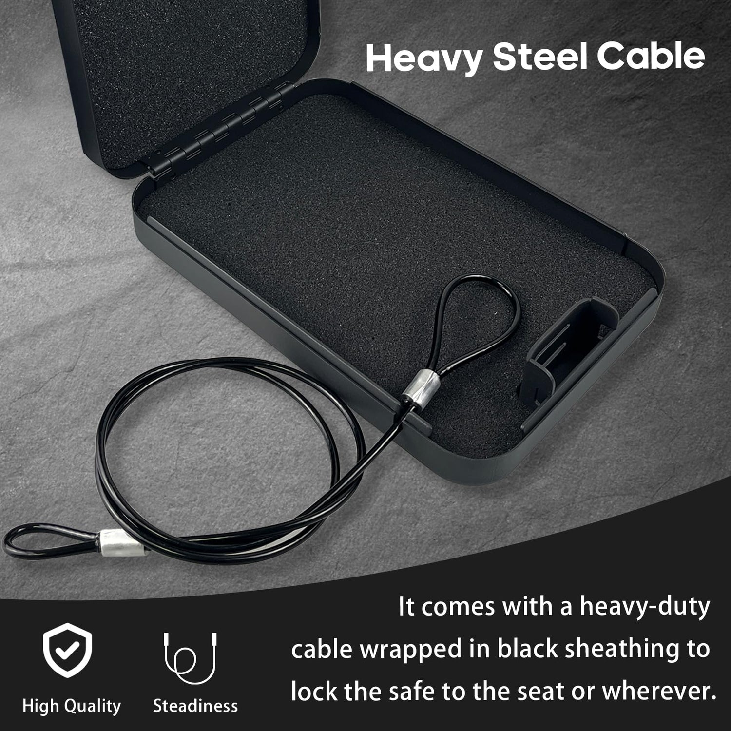 - 【Steel Cable For Fixing】It comes with a heavy-duty cable wrapped in black sheathing to lock the safe to the seat or wherever. To secure the pistol case to a fixed object, please loop the cable around the object and place the cable’s end into the notch on the side of the case.