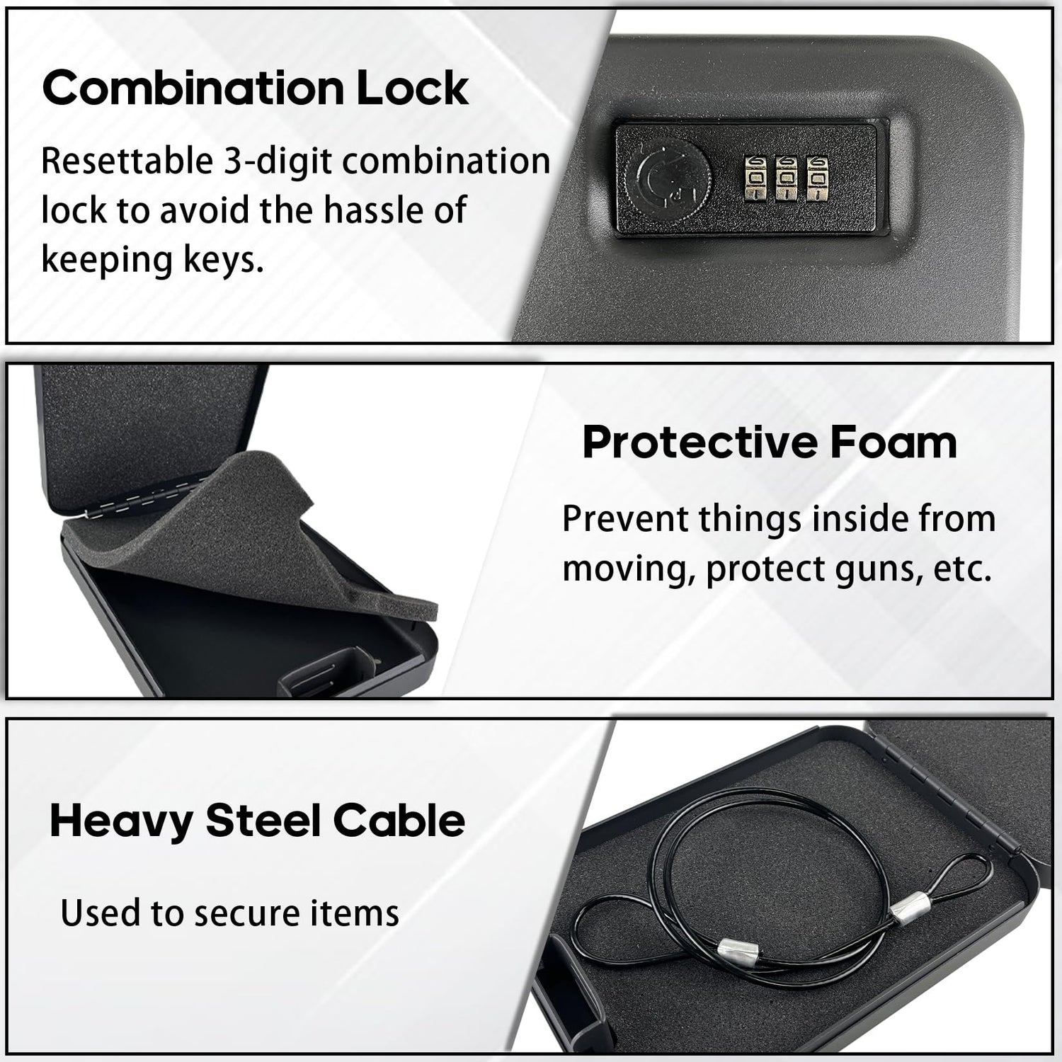 - [ Resettable 3-Digit Combination Lock - No Keys, No Hassle ] Forget the frustration of lost keys! Our portable gun safe features a resettable 3-digit combination lock, allowing you to set your own secure code. The default combination is 000, and you can easily change it to a preferred code for added security. This design eliminates the need for keys, offering a quick, reliable, and keyless access solution for your firearms and valuables.