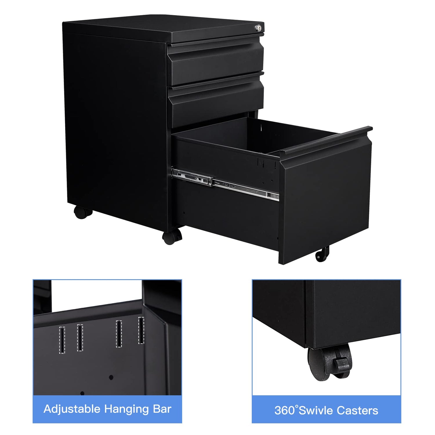 Details: Yizosh MOBILE FILE CABINET WITH 3 DRAWERYizosh Tall Mobile File Cabinet with 3 Drawer is an ideal solution for keeping all of your business, work, and personal supplies. SpecificationsMaterial: High quality steel Color: Black & White Product Weight: 49 lb Assembly: NO Assemble Overall Dimensions: 18.5" W x 25" D x 20.4" H. Product description The storage cabinet can bears up to a lot of weight due to it's special cold-rolled steel material. This kind of material is much harder and strong than typical steel. Customize your cabinet to suit your needs. Steel cabinets are equipped with 3 Drawer. The file cabinet is great for storing Legal/Letter/A4 File and anything else that is cluttering your home.