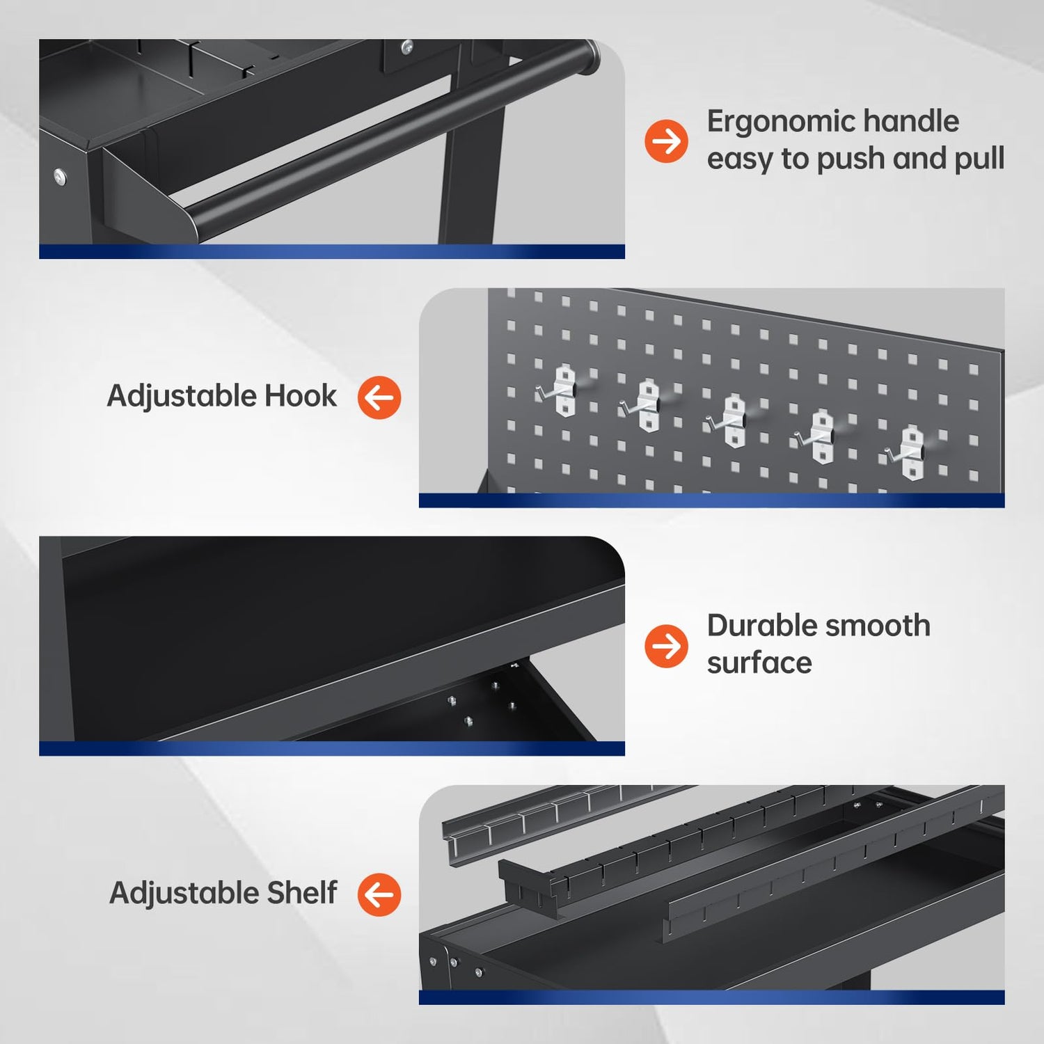 - 【Tool Cart on Wheels】Equipped with 4 flexible rotating casters (2 lockable), you can move the rolling utility cart to any place without effort. And the brake system makes this tool organzier convenient for you to stop the rolling tool cart as needed. Besides, there is a humanized handle for convenient control when moving the tool cart for mechanics around.