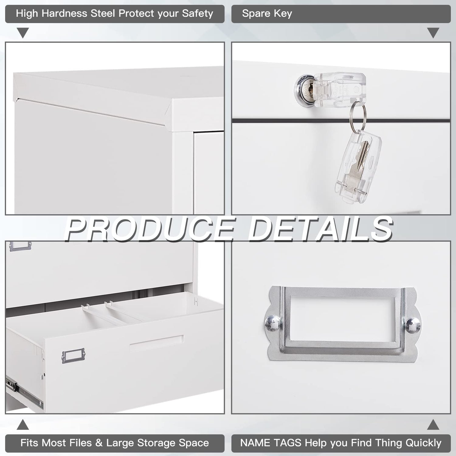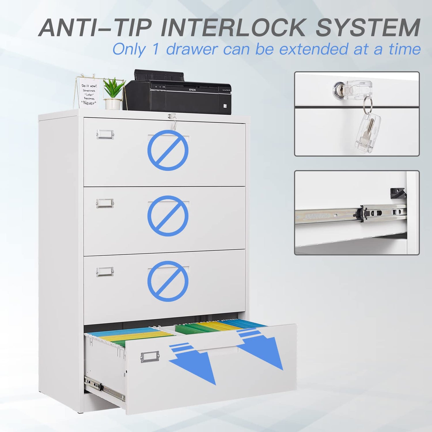 - 【Higher Level Security】The metal file cabinet is composed of exactly designed interlock device and external ANTI-TILT mechanism. Only one drawer could be opened at the same time for safety sake, combine this feature with the ANTI-TILT mechanism, this 4 drawer file cabinets ensures much more safety than others.