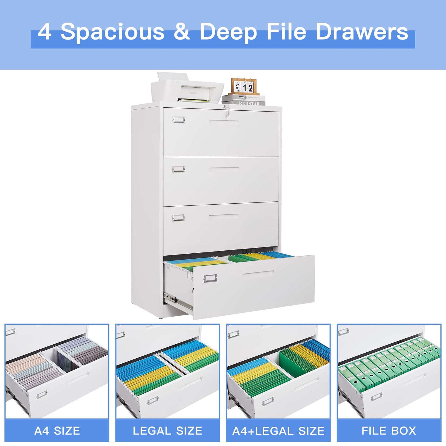 - 【Durable & Stable】: Whole-in-one reinforced with high-strength cold-rolled steel frame, which allows each drawer of lateral filing cabinet for holding 120 lb, for a total of 480 lb. Coated with Electrostatic phosphorus free epoxy spray layer, making it very strong and immune to corrosion and rust, Ideal for long-term to use in home or office.