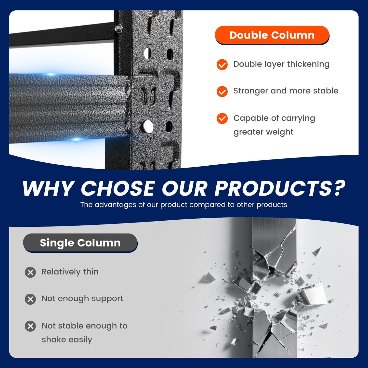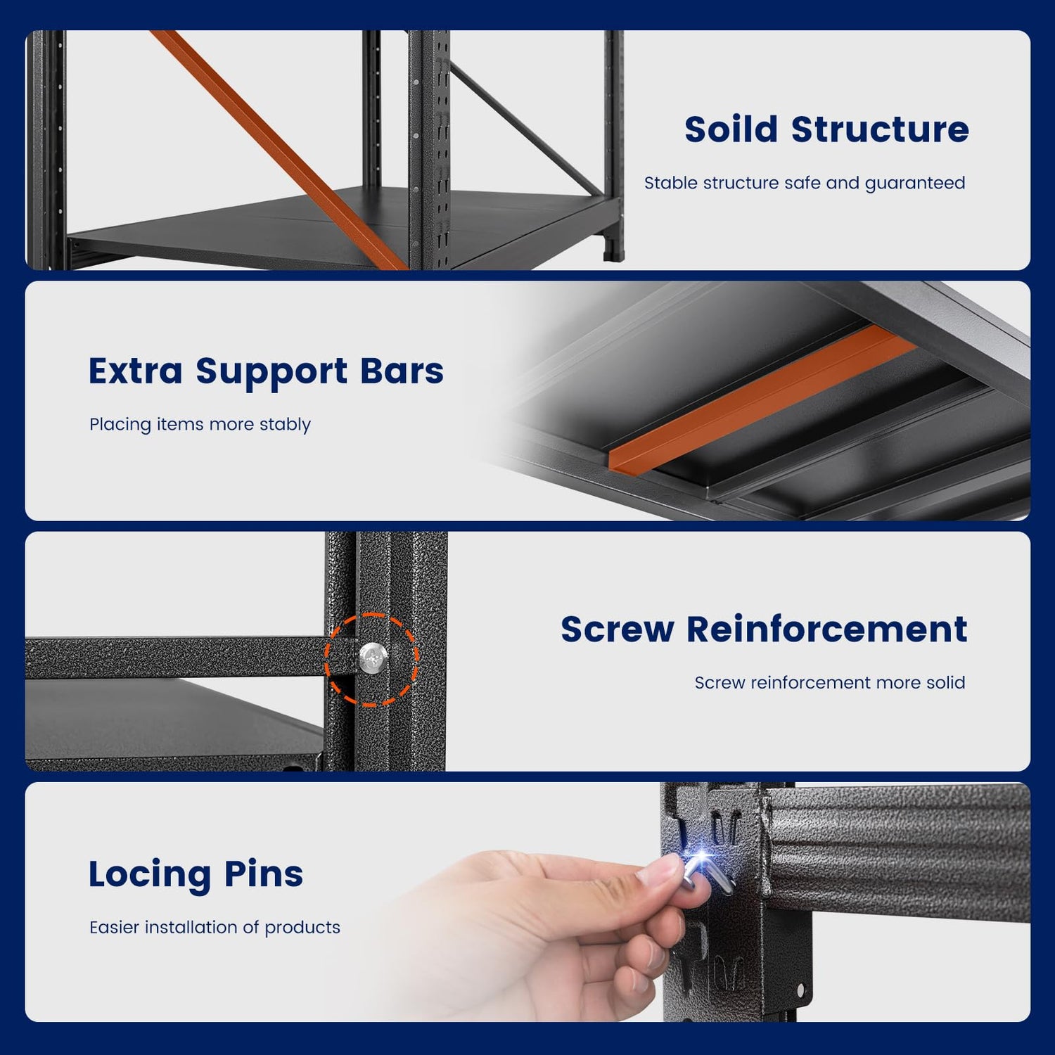 - 【Sturdy Design】The garage shlelving units reinforced diagonal braces designs,its could evenly distribute the weight,features reinforcing ribs for added strength,ensuring strong stability and resistance to deformation.