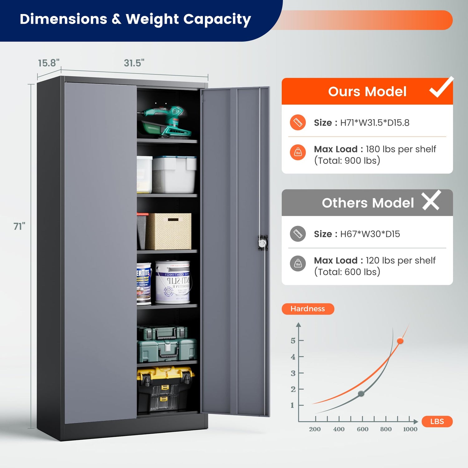 - 【Large Storage Space】 – Our Metal Storage Cabinet have a storage size of H71*W31.5*D15.8 inches, with a spacious interior space to accommodate large items, and 5 adjustable shelves can be personalized according to your needs, suitable for home, office or garage.