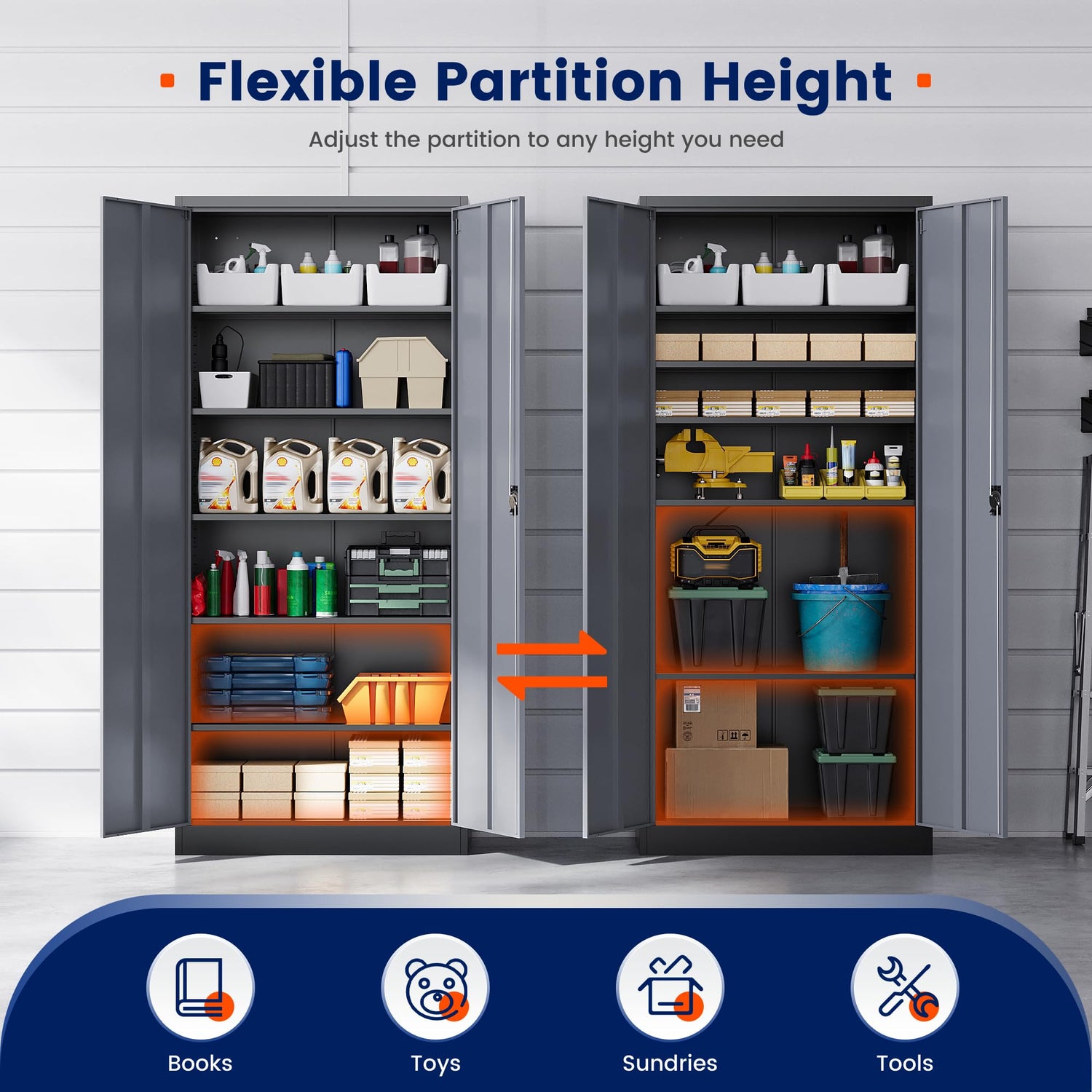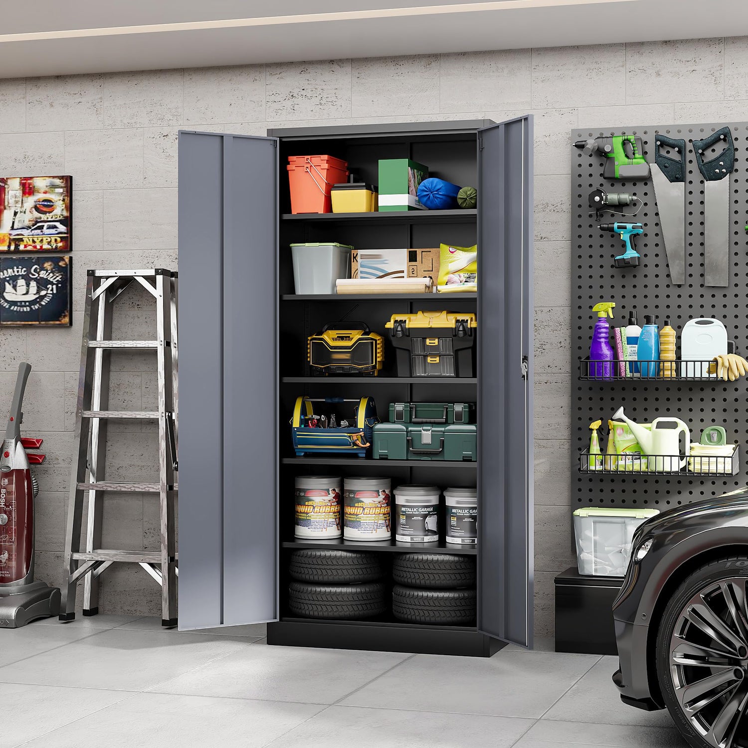 Yizosh Metal Garage Storage Cabinet with 5 Adjustable Shelves, 71" Metal Storage Cabinet with Locking Doors, Steel Tool Cabinets for Home, Office, Garage, Warehouse, School (Black Grey)